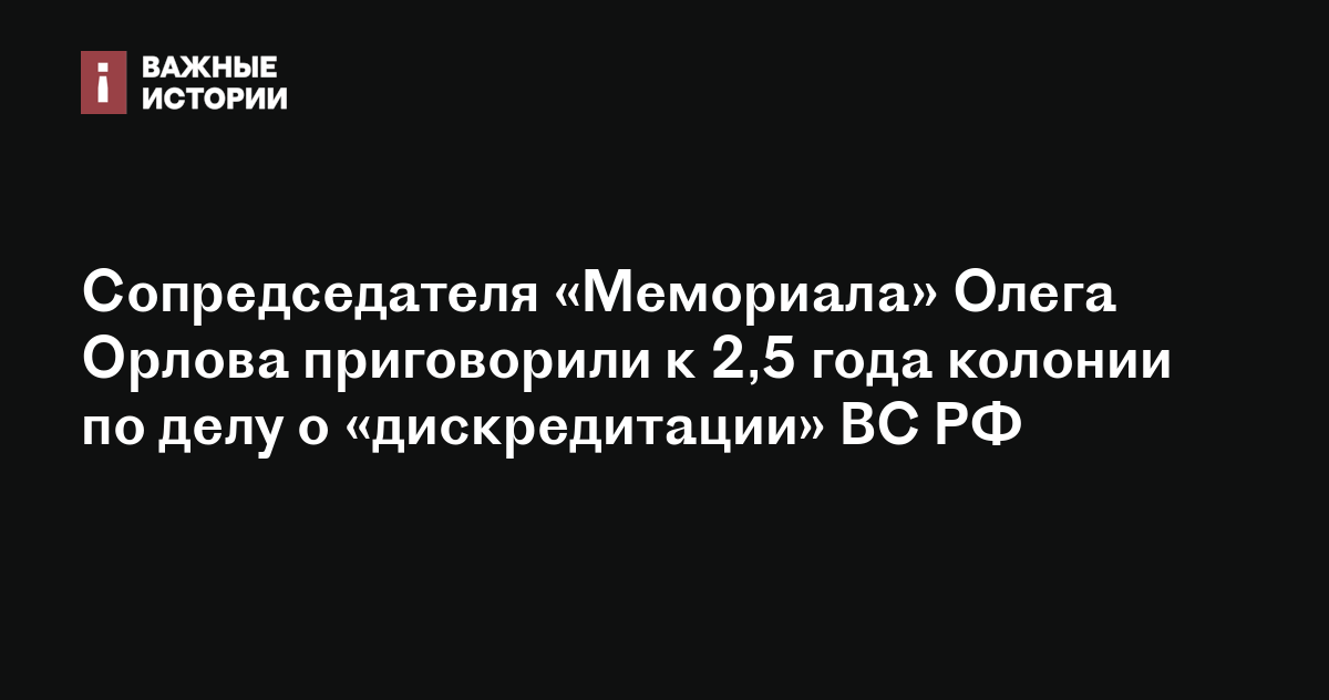 Сопредседателя «Мемориала» Олега Орлова приговорили к двум с половиной годам колонии по делу о «дискредитации» ВС РФ. Об этом сообщает «Мемориал».