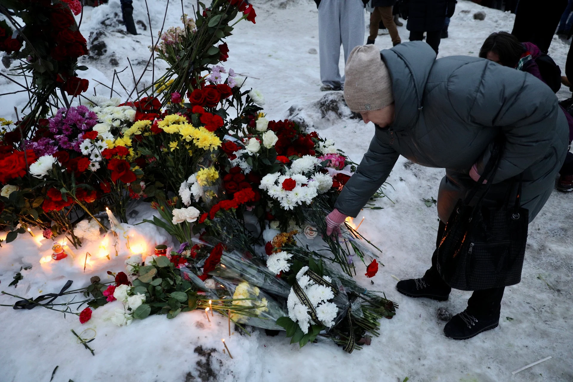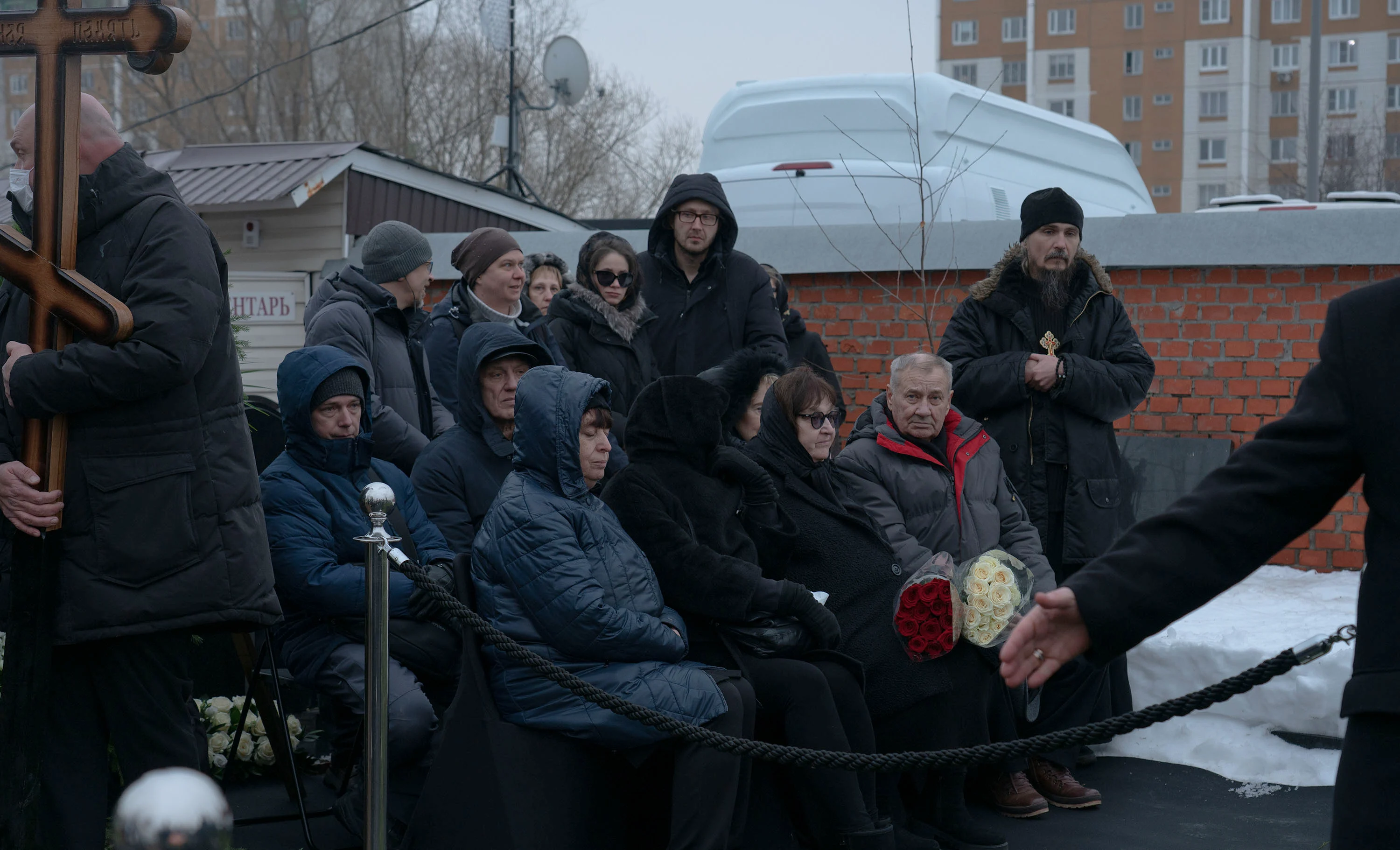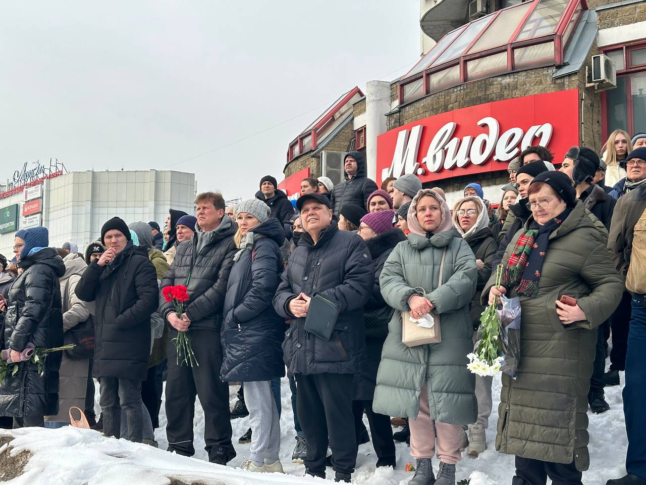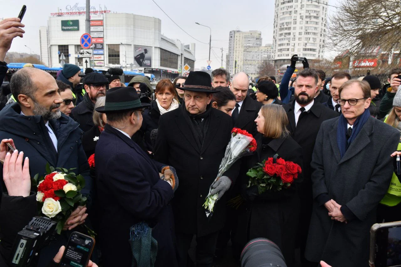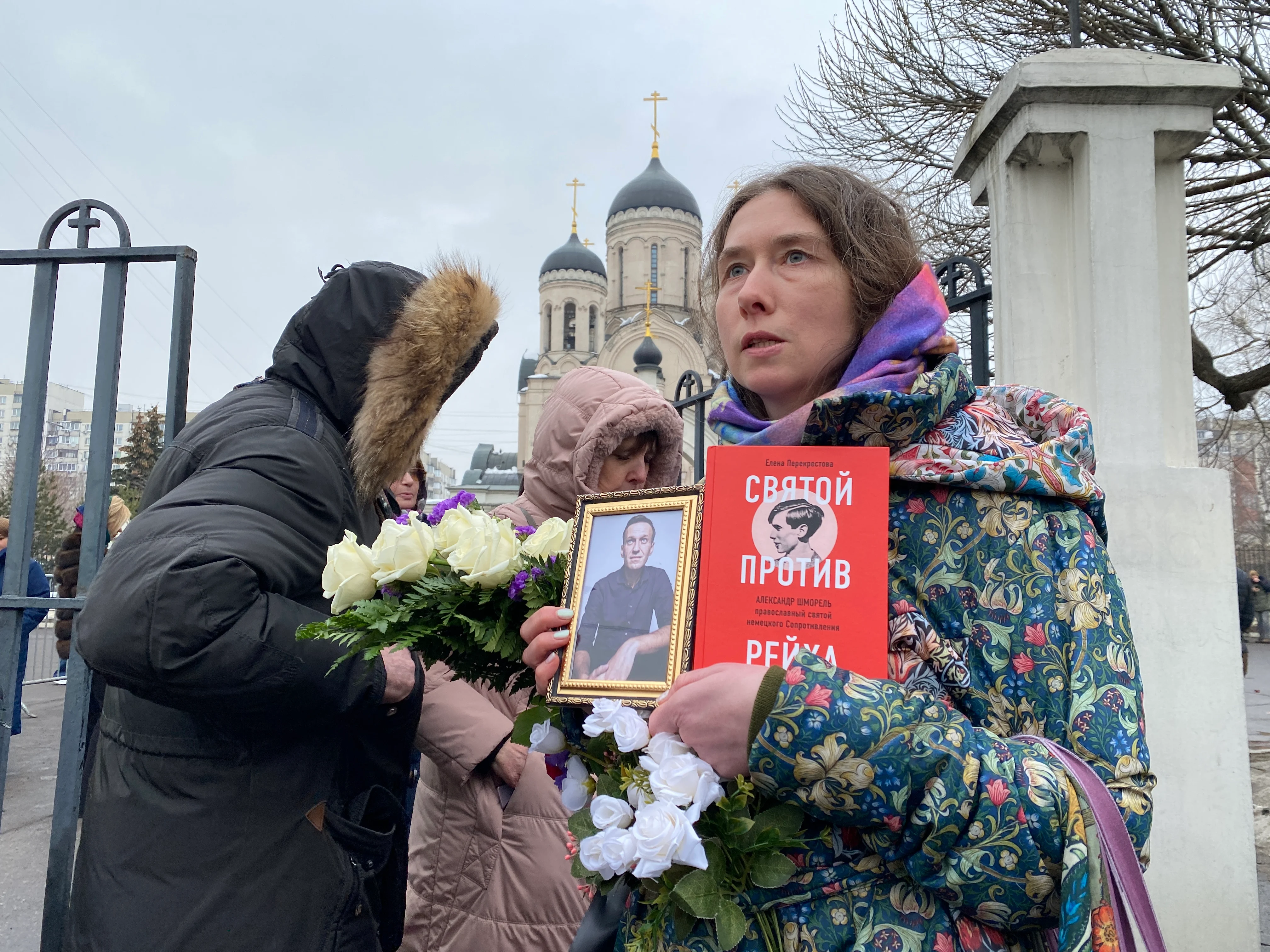 Тем временем очередь к церкви по оценкам корреспондента «Медиазоны» растянулась на 700 метров — и люди продолжали идти, чтобы проститься с политиком. В числе тех, кто пришел к храму можно было заметить Екатерину Дунцову, Бориса Надеждина, экс-мэра Екатеринбурга Евгения Ройзмана и европейских дипломатов. А у могилы, где вскоре должны были захоронить тело Алексея Навального, появились несколько венков, в том числе от политолога Екатерины Шульман.