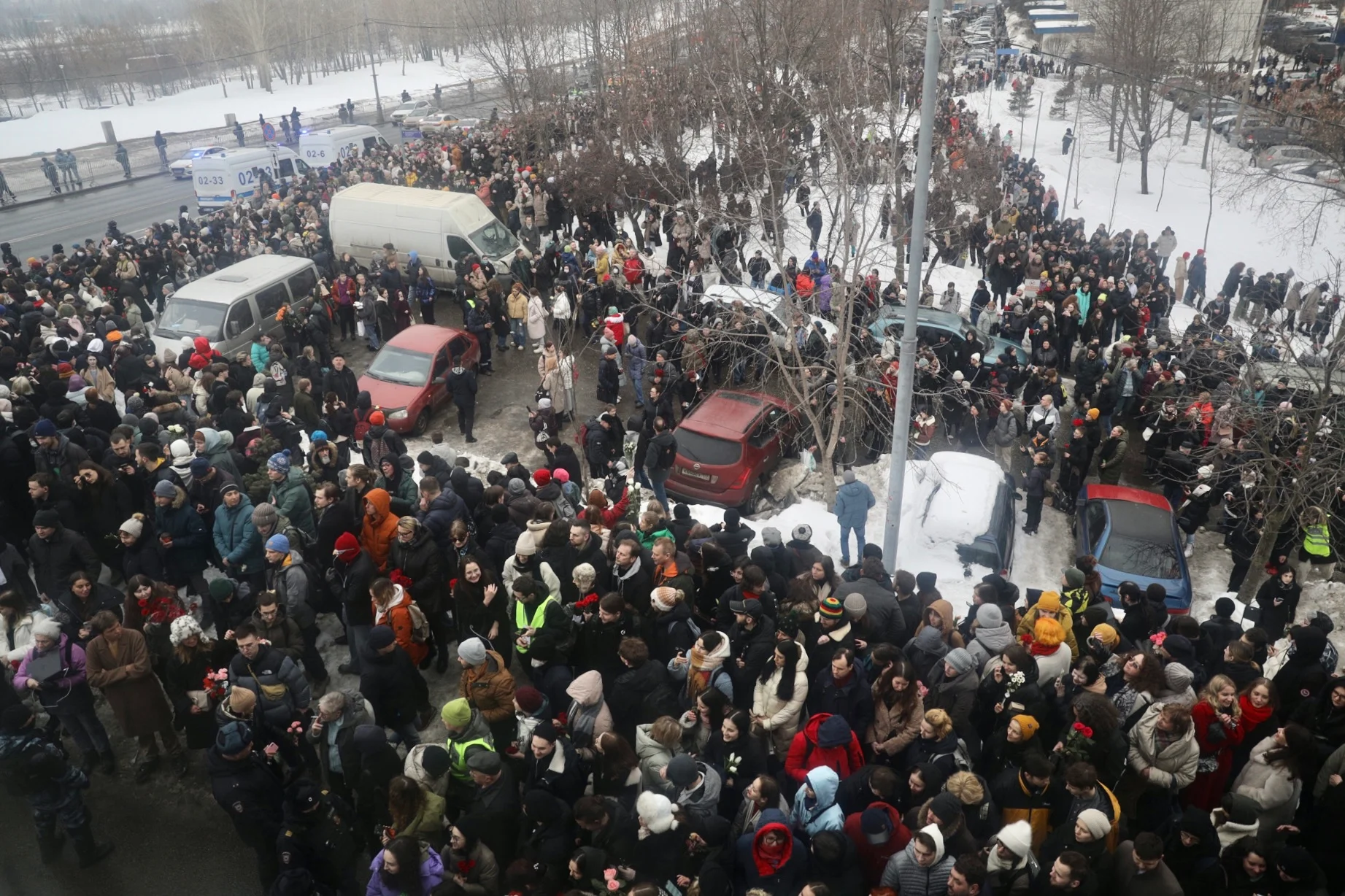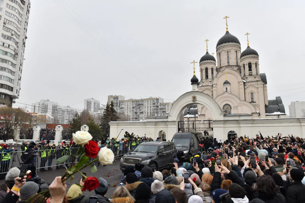 К полудню у церкви, где ожидалось отпевание Навального, собралось около тысячи человек, желающих проститься с политиком. Тело Навального из морга должны были выдать родственникам к 10 часам утра, однако эта процедура затянулась. В итоге катафалк с телом выдвинулся к храму иконы «Утоли моя печали» только к часу дня.