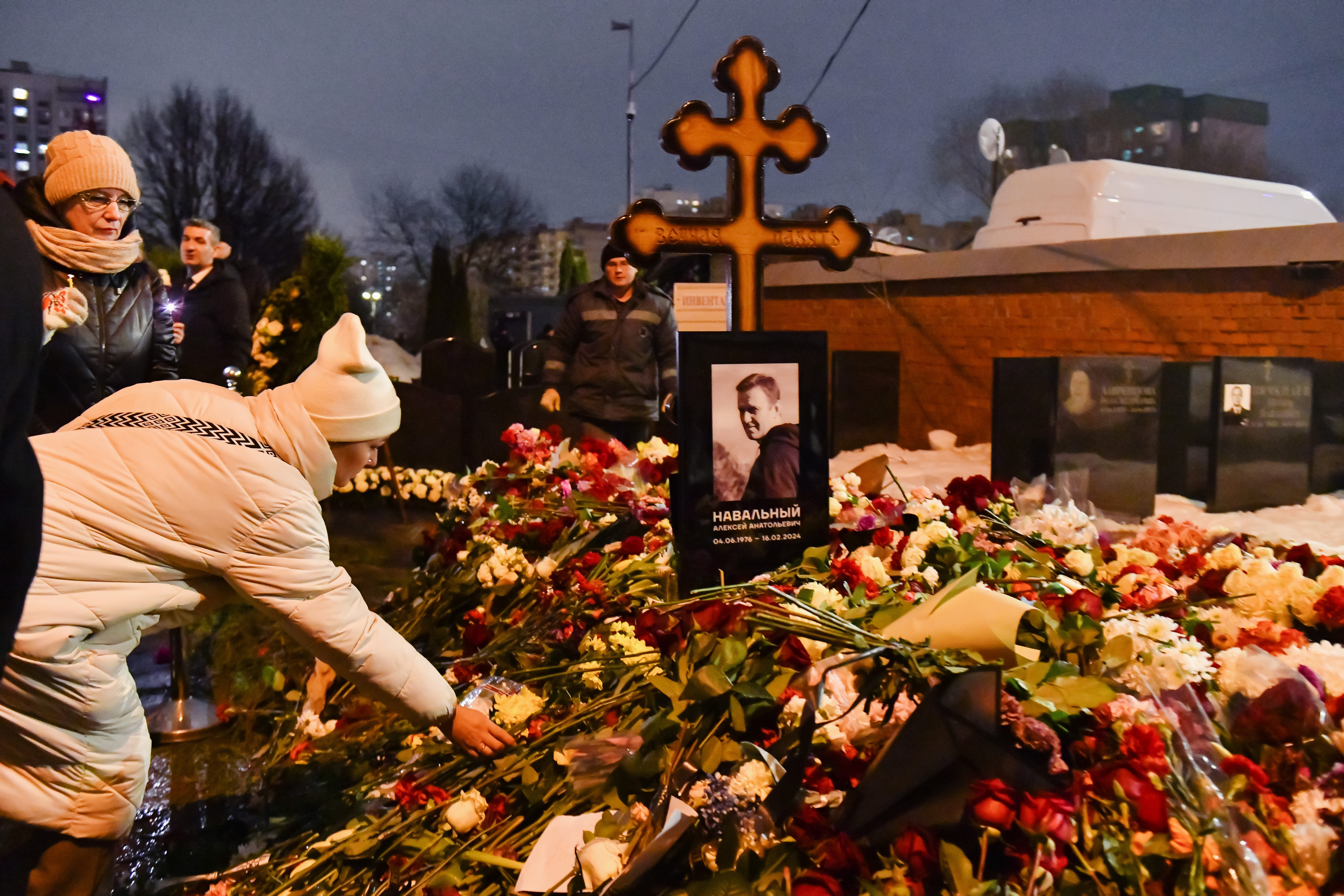 Около семи часов вечера на могиле оппозиционера установили крест и фотографию.