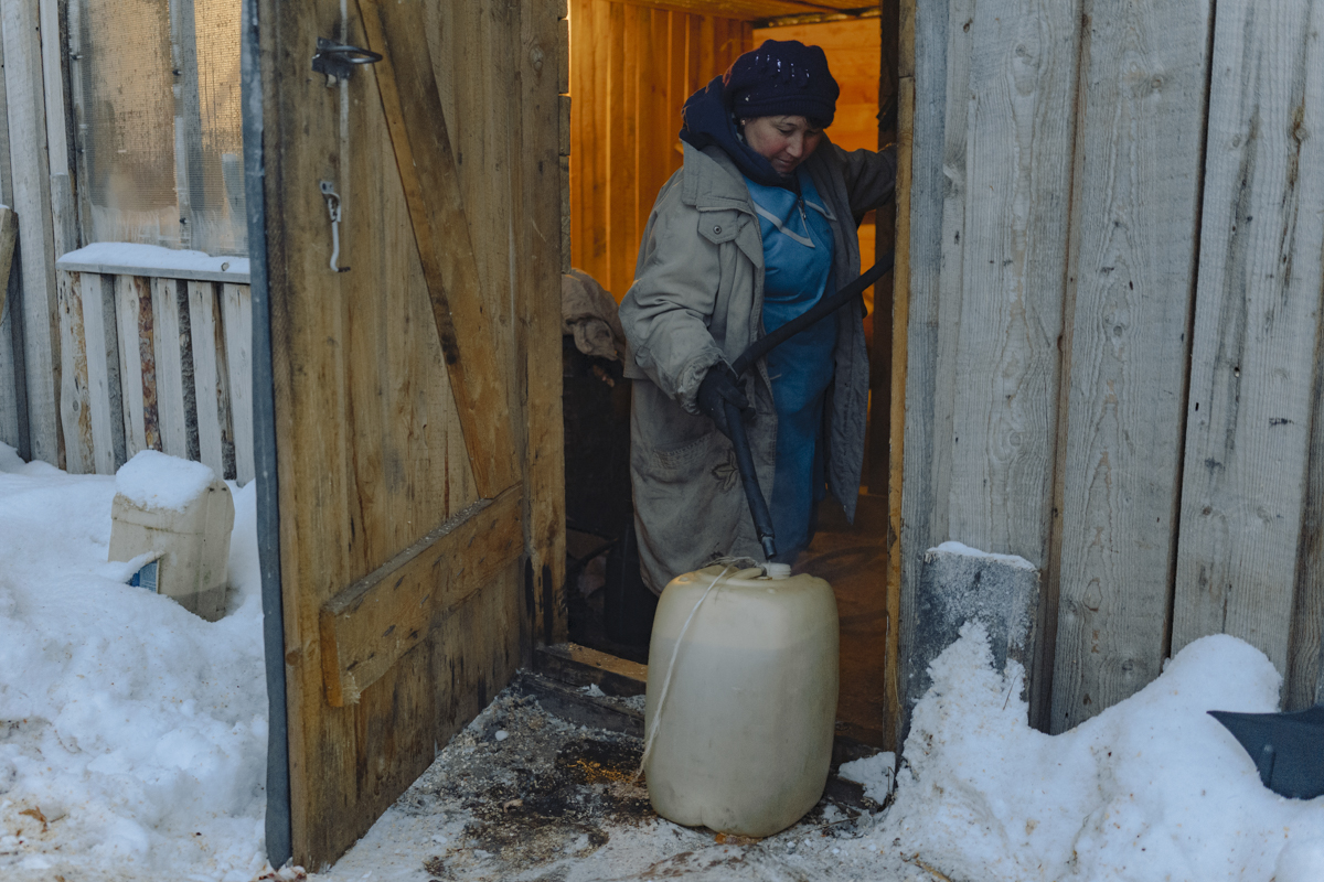Светлана набирает в ковш воду, чтобы наполнить ею рукомойникФото: Анастасия Шумихина для ТД А «случаи чего» уже были: в деревню порой заходят непрошеные гости. То собирают металлолом, то ищут, чем поживиться. У Василия есть ружье — несколько раз он им пользовался, стрелял по колесам воров, и те отчаливали. Ну и потом — волки, рыси, лоси…