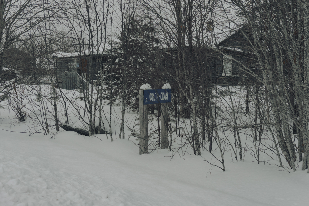 Деревня Филинская находится в 70 километрах от городка Тотьмы. Летом дорога разбита, а сейчас, когда колдобины закрыл снег, машина неслась резво. Но, кроме сказочного леса, впечатлений никаких: связь пропала сразу, радио захрипело и смолкло.