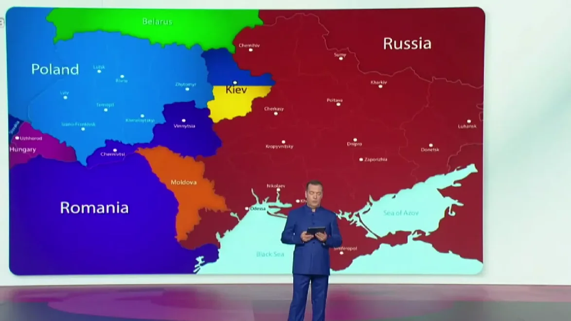 Standing in front of an alternative map of Eastern Europe in which Eastern Ukraine is occupied by Russia and its Western regions are divided between Poland and Romania, Medvedev told the audience that Ukraine was “indisputably” part of Russia.