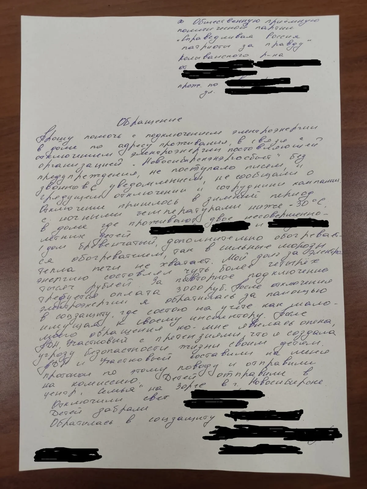 В Новосибирской области органы опеки забрали двоих детей у местной жительницы Аллы Замятьевой из-за отсутствия электричества и тепла в доме. Копию ее письма опубликовало региональное отделение партии «Справедливая Россия — За правду», куда она и обратилась.