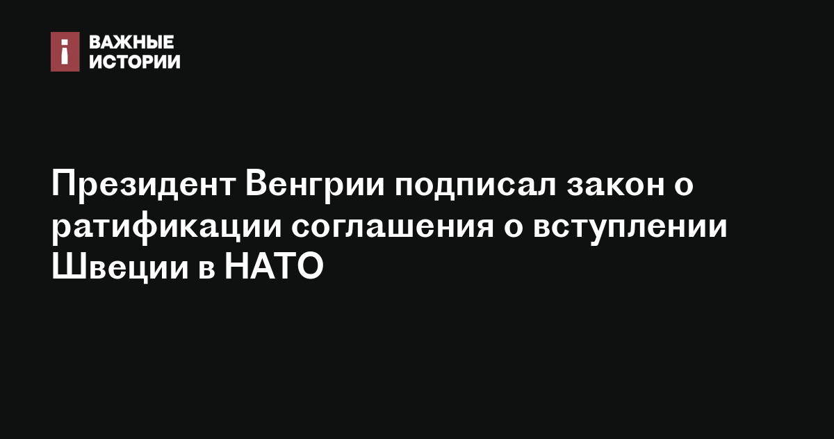 Президент Венгрии Тамаш Шуйок подписал закон, ратифицирующий соглашение о вступлении Швеции в НАТО, сообщает Reuters. Шуйок вступил в должность 5 марта, подписание закона стало его первым решением.