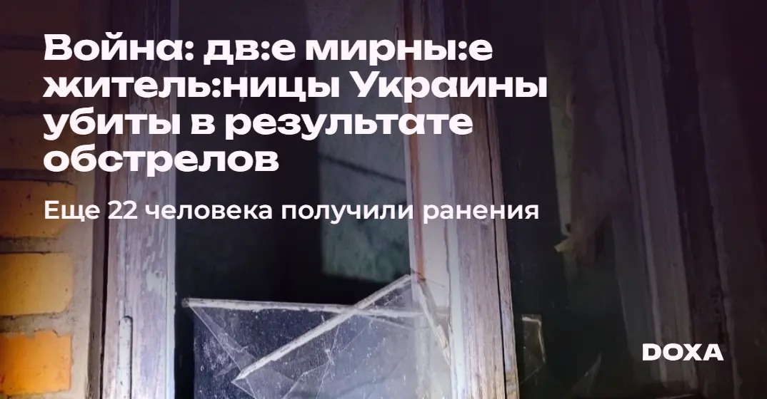 По меньшей мере дв:е мирны:е житель:ницы Украины были убиты в результате обстрелов российской армии. Еще 22 человека получили ранения. Россия обстреляла Донецкую, Херсонскую, Харьковскую, Запорожскую, Николаевскую, Сумскую, Черниговскую, Кировоградскую и Днепропетровскую области Украины, сообщили сегодня администрации этих регионов.
