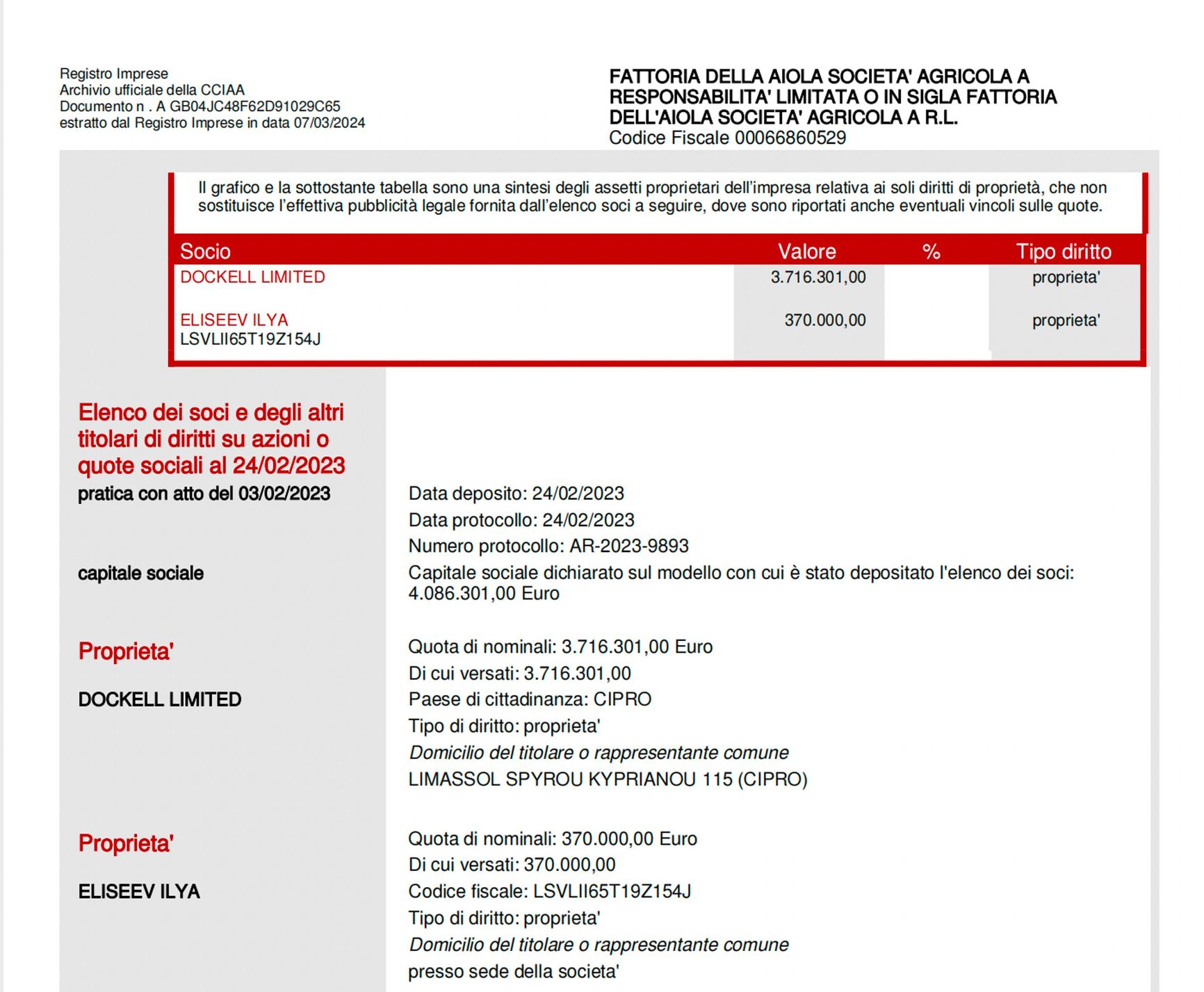 The Tuscan winery Fattoria della Aiola was first linked to Dmitry Medvedev by the late Alexei Navalny’s Anti-Corruption Foundation (FBK) back in 2017. At that time, the Italian business was registered under the Cypriot offshore company Furcina Ltd, owned by Ilya Eliseev — a classmate, trusted confidant, and close friend of Medvedev’s. Since then, the ownership structure of the Italian company Fattoria Dellа Aiola Societa Agricola A.R.l. has changed: instead of one Cypriot offshore entity, another has emerged, with part of the shares now held directly by Eliseev, as confirmed by The Insider.