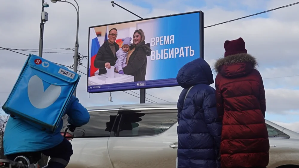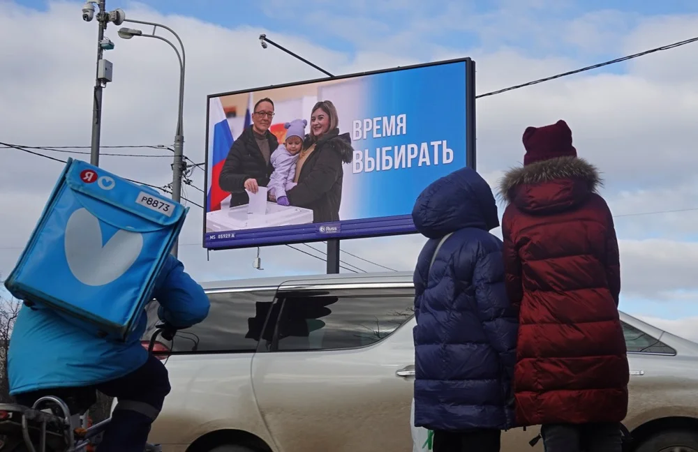A billboard reading ‘Time to choose’. Moscow, 11 March. Photo: EPA-EFE/MAXIM SHIPENKOV