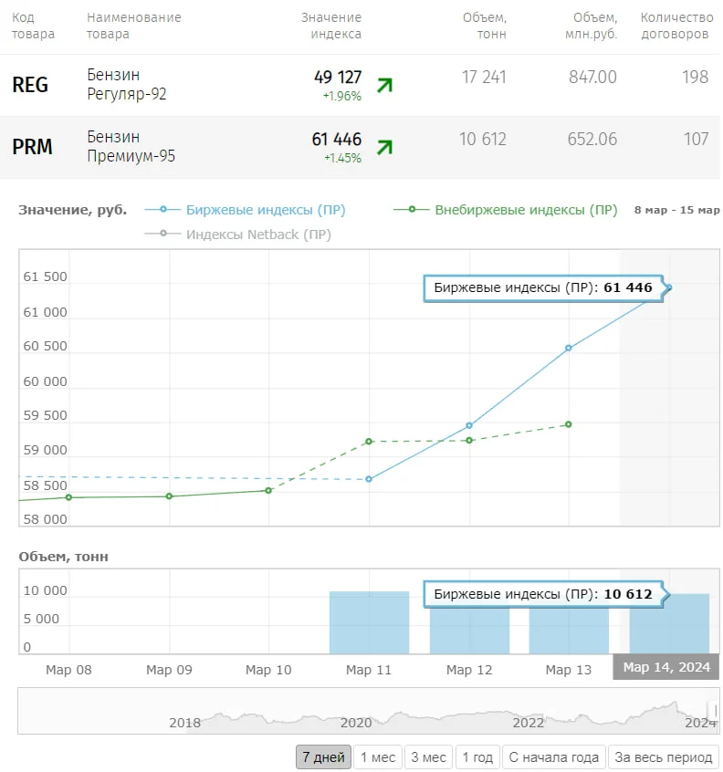 Похожая ситуация с бензином АИ-92: 12 марта биржевая цена этого вида топлива за тонну была 47 559 рублей, вчера стоимость выросла до 48 182 рублей за тонну, а сегодня достигла 49 127 рублей.