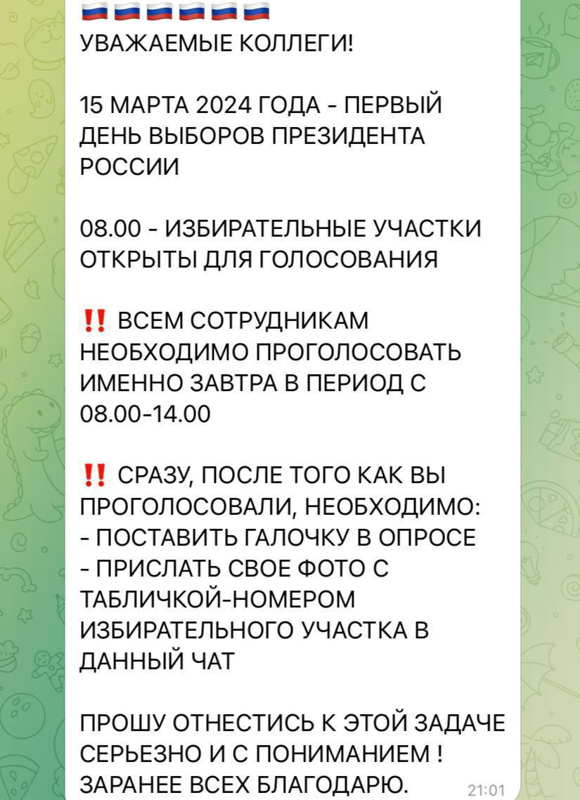 Как следует из скриншотов, сотрудников центра просят присылать в рабочий чат фото с табличкой с номером избирательного участка после голосования. При этом работников просят проголосовать в пятницу, 15 марта, с 8:00 до 14:00.