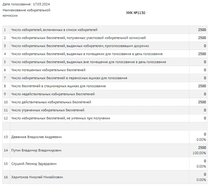 К УИК №1130 были прикреплены 2500 человек. Они также пришли на участок в основные дни выборов и проголосовали за Владимира Путина. Ни на одном из двух участков никто не голосовал досрочно, вне участка, а также не портил бюллетень.