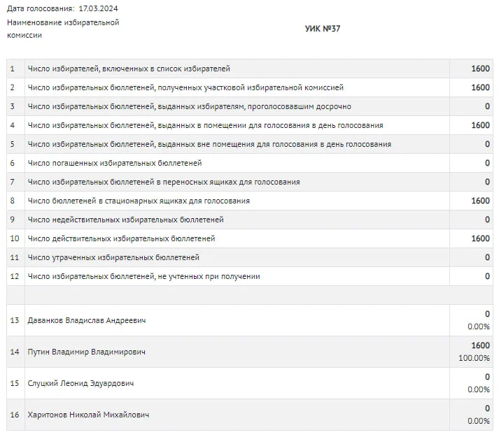 В список избирателей на УИК №37 были внесены 1600 человек. Все они пришли на участок в основные дни выборов и отдали свой голос за действующего президента России.