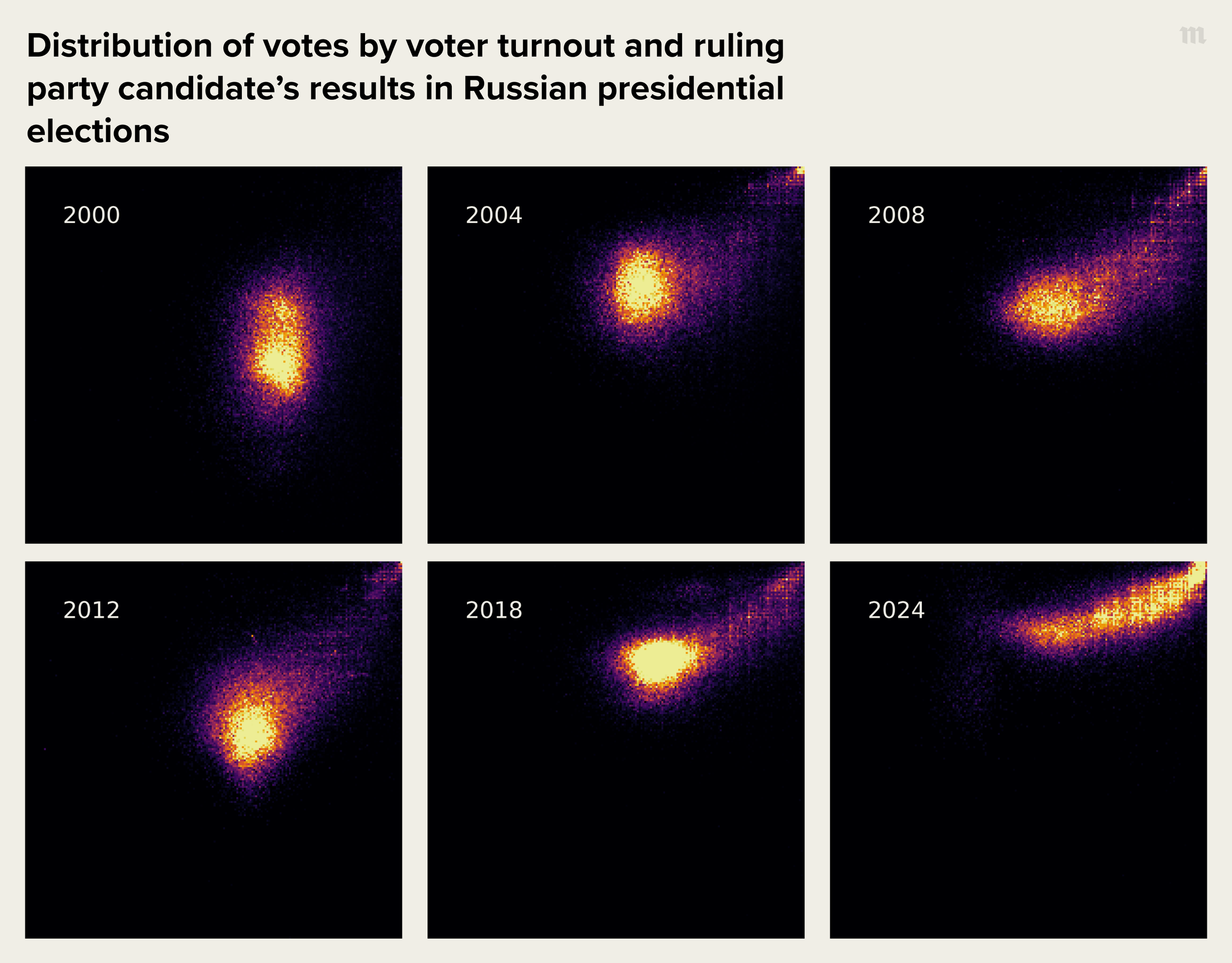 Leading independent election analyst Sergey Shpilkin has been studying the distribution of votes and voter turnout in Russian elections since the early 2010s and has come up with a method for distinguishing between legitimate votes and falsified ballots. According to Shpilkin’s logic, since the exact number of voters who come to a given polling station and the number of votes they cast for different candidates hinge on numerous random factors, the overall spread of voter turnout and candidate results across polling stations should be characteristic of random processes and fall along a normal, bell-shaped curve. On a scatter plot of these two variables, the polling stations should appear as a single, symmetrical spot. Any deviations from this distribution would be considered anomalous and require a separate explanation. These kinds of deviations have been observed in Russian elections since at least 2004.