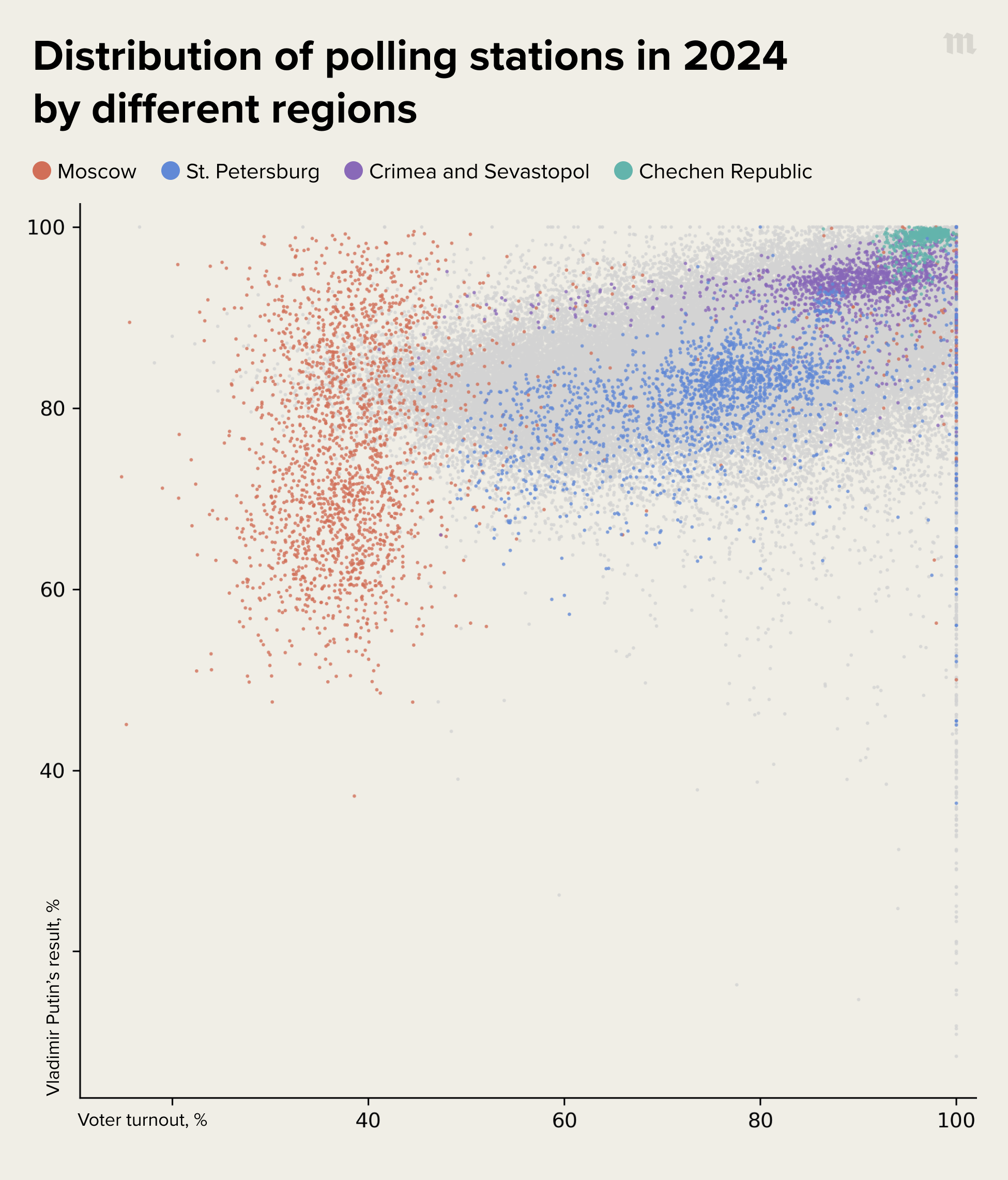 All current analyses of Russia’s voting results, both here and in other publications, are based on data from the Russian Central Election Commission’s (CEC) website that were collected and made publicly available by programmer and electoral analyst Ivan Shukshin. The data cover 98 percent of polling stations, including those from Russian-annexed Crimea but excluding those from other occupied areas of Ukraine. Ivan Shukshin’s own analysis of the election results can be found here.