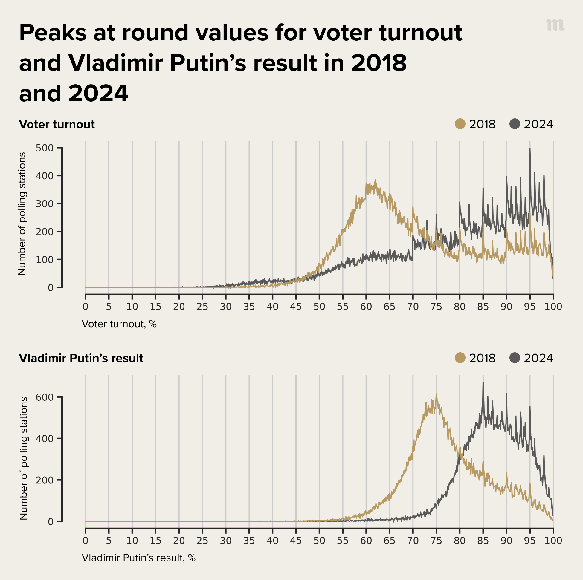 To quantify how much worse the situation’s become, we analyzed the 2024 data collected by Ivan Shukshin using the same methods. The graphs below show the distribution of polling stations by turnout and by Putin’s percentage of the vote for both 2024 and the previous presidential election, in 2018.