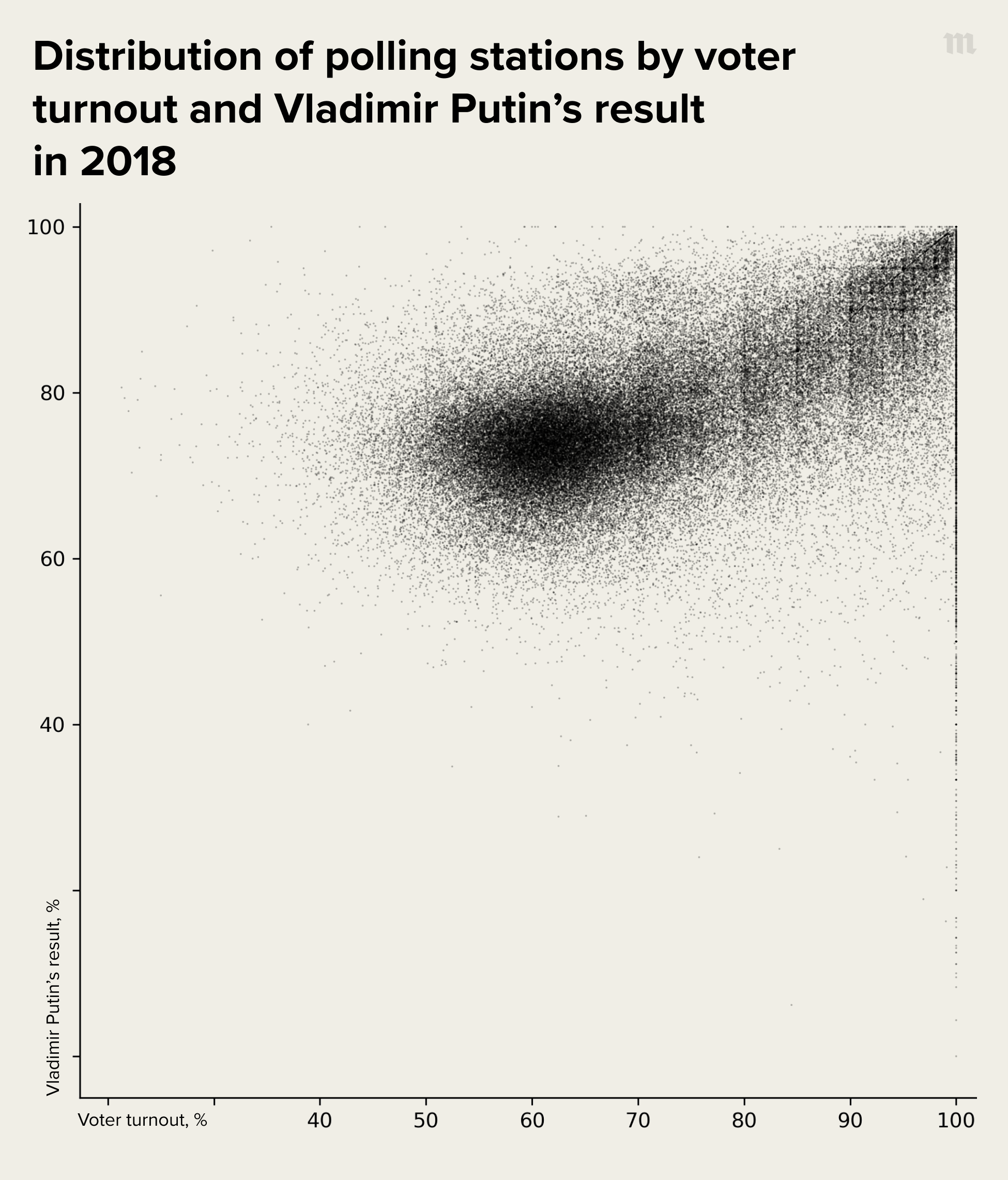 This is what such a scatter plot from the 2018 Russian presidential elections looks like: