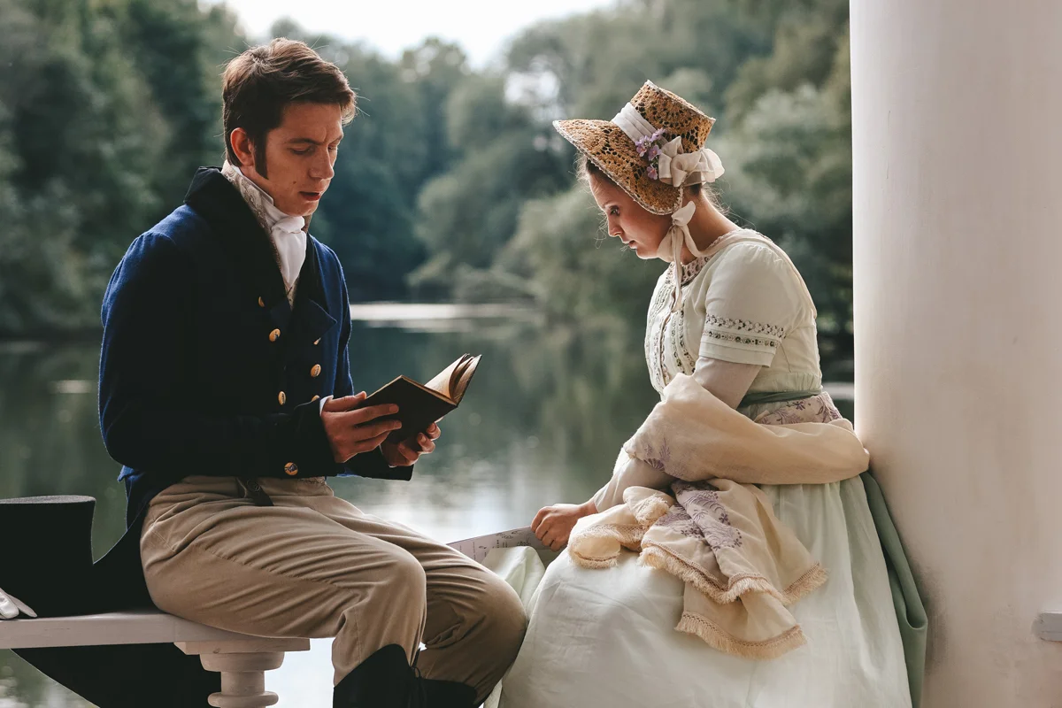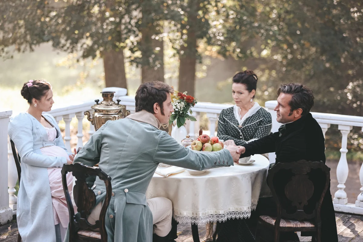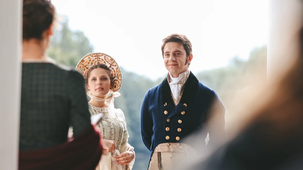 Но побуквенно перенести на экран поэзию — новаторскую не только по стилю, но и по композиции, — действительно невозможно, поэтому Андреасяну и Гравицкому пришлось превращать четырехстопный ямб в прозу. Возвысившись до Пушкина, нынешние гении пера выдали пересказ, по своему уровню сопоставимый с историческими опусами «Первого канала» и «России-1». Ну, вроде сериала «Великая» по сценарию того же Гравицкого, где помещенные во дворцы говорящие головы сухо зачитывают лениво написанный текст. Самое же удручающее в том, что этот самый текст в «Онегине» зачитывают люди, совершенно для того неуместные. В оригинале всем ключевым персонажам по 13–18 лет, и их мотивы и поведение объясняются незрелостью. Что мы видим в фильме? Молодого повесу и ловеласа со внешностью 40-летнего Виктора Добронравова, у которого на висках уже проступает благородная седина. В свою очередь скромную и замкнутую Татьяну, без памяти влюбившуюся в загадочного Онегина, играет 30-летняя Лиза Моряк, жена режиссера. Юному романтику Ленскому и его возлюбленной, сельской нимфе Ольге, также по тридцать. В итоге взрослые люди, которые к финалу становятся еще на шесть лет старше, отчего-то ведут себя как подростки.