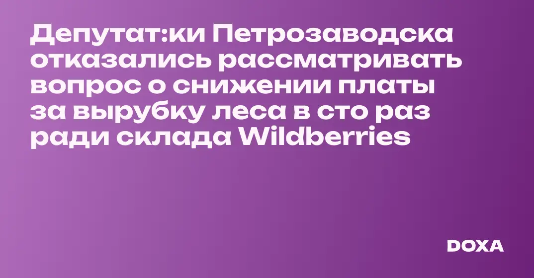 Петрозаводский городской совет снял с повестки вопрос о снижении в сто раз платы за вырубку леса для больших проектов. Карельские чиновни:цы планировали внести такое изменение ради строительства нового распределительного центра Wildberries. Снять вопрос с повестки предложила депутатка Эмилия Слабунова из партии «Яблоко».
