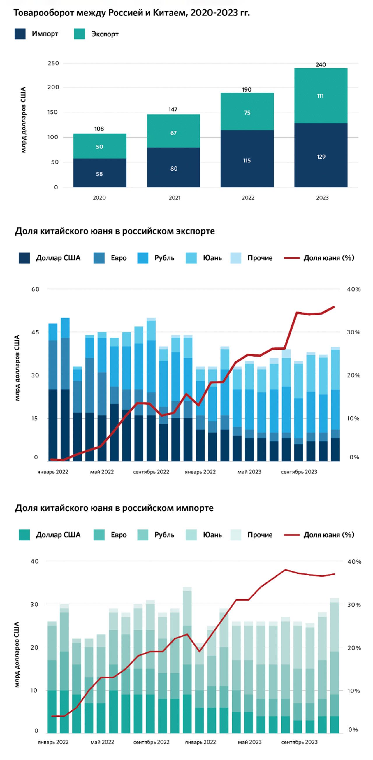 В декабре 2023-го на юань в российском экспорте пришлось 35,8%, а в импорте — 37% (в то время как на рубль — 35,7 и 31,5% соответственно). В результате этого чистый экспорт в валюте вырос до максимума с января и составил 5,4 миллиарда долларов (среди которых 2,8 миллиарда — это юани). Что касается юаней, хранящихся в российских банках на счетах компаний и людей, то в 2023 году речь шла о сумме (в пересчете на доллары) 68,7 миллиарда долларов. На долларовых счетах тем временем находилось 64,7 миллиарда. Кредитование компаний в юанях выросло в 3,6 раза — до 46,1 миллиарда долларов (прежде всего за счет конвертации долга из доллара и евро).