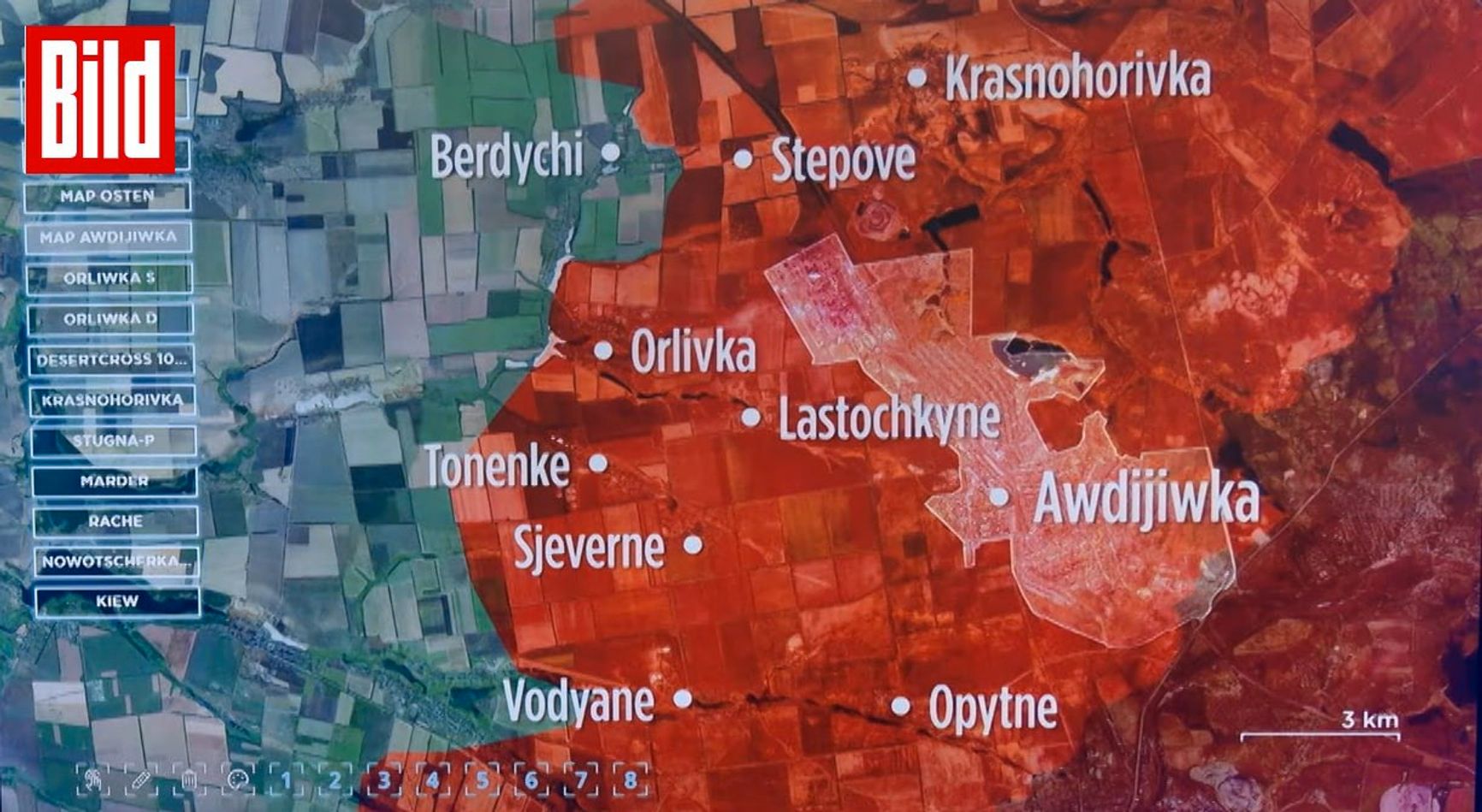 Журналист немецкого издания BILD Юлиан Рёпке утверждает , что российским войскам удалось ценой значительных потерь полностью взять села Тоненькое и Орловка к западу от Авдеевки . Как отмечает Рёпке, бои продолжаются лишь за Бердычи .