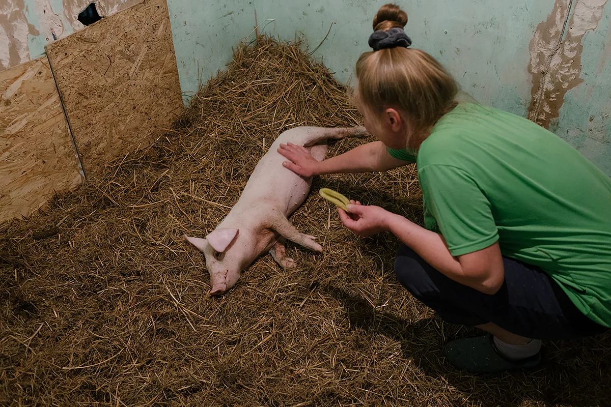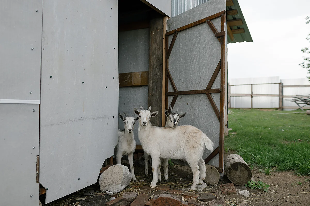 Увидев хозяйку, животные обступают ее со всех сторон, одна молодая козочка так и льнет к ногам женщины. Инна гладит ее и говорит, что козочку бросила мама, не стала ее кормить, потому что малышка родилась болезненной. Но Инна забрала животное в дом и сама выкормила молоком из бутылочки с соской.