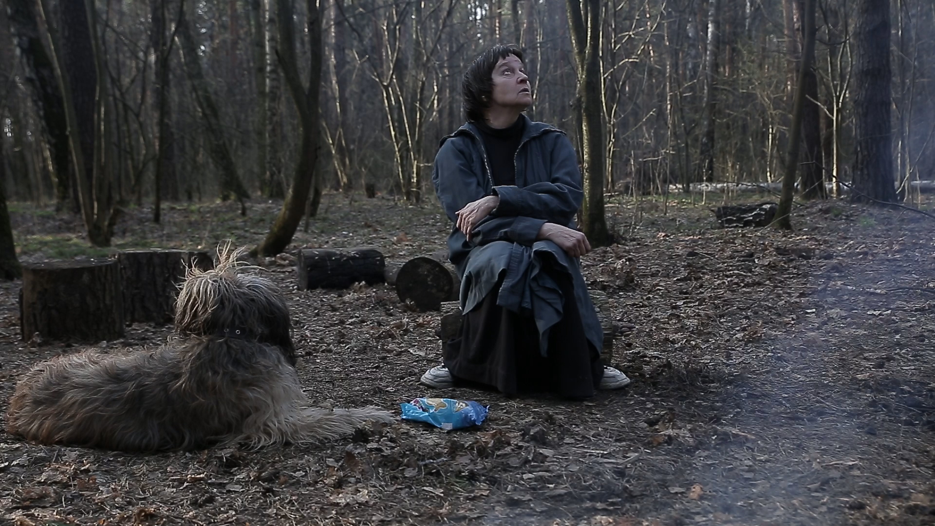 Женщина сидит на пеньке на опушке перед костром, рядом на жухлых листьях лежит лохматая собака. Татьяна беззвучно двигает губами, как бы находясь в оживленной беседе с кем-то невидимым: кивает головой, соглашаясь, потом делает жест рукой, как будто отказываясь от чего-то. Мечтательная улыбка на ее лице поминутно сменяется страдальческим выражением. Она извиняющимся полушепотом объясняет: «Я им немножко отвечаю. Я же немножко шизофреник. Ничего не сделаешь». Она говорит что-то еще, но слов разобрать нельзя.