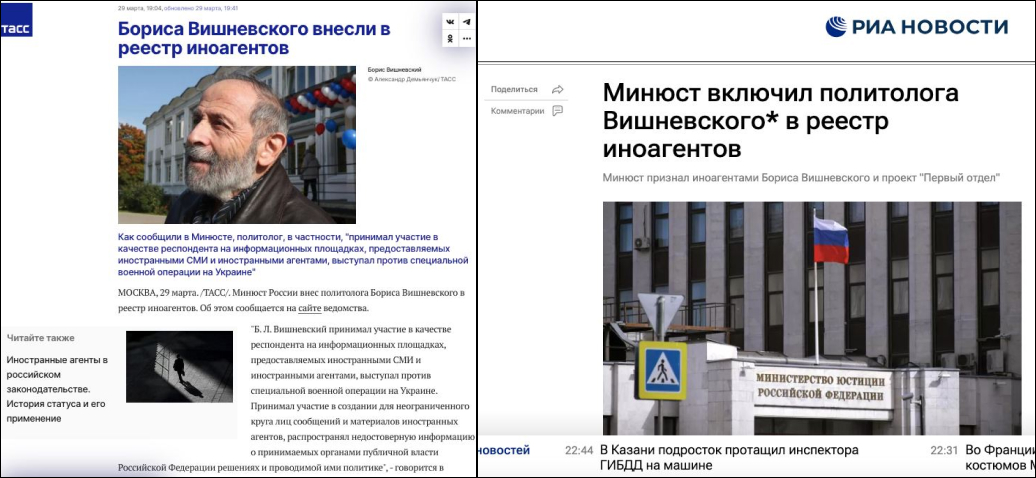ТАСС и РИА Новости рассказали о внесении в реестр «иноагентов» «политолога Вишневского»