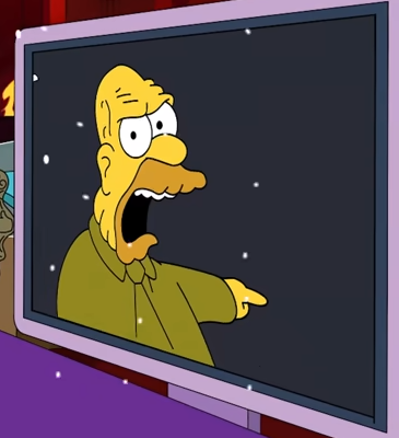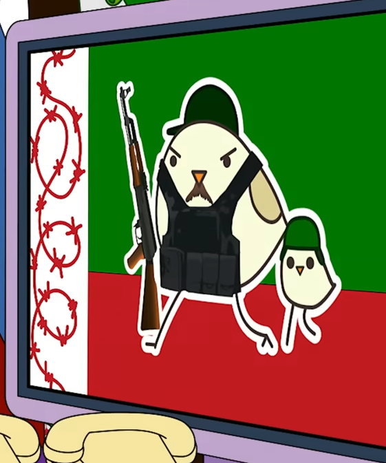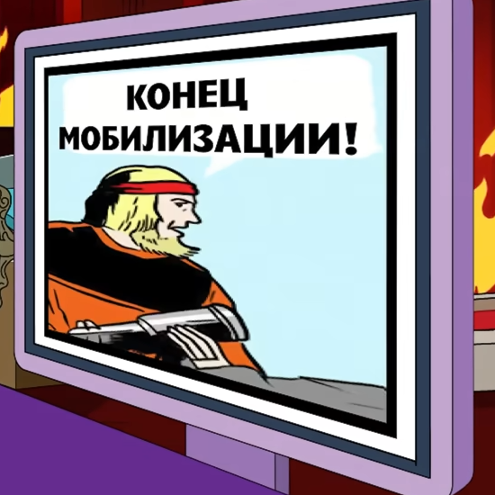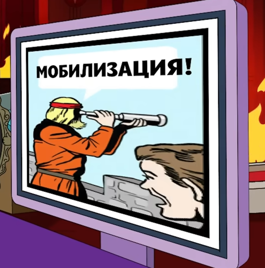 Zhgun uses several different memes and cultural references to depict the Wagner Group mutiny in late June 2023. The rebellion’s leader, Yevgeny Prigozhin, appears as Abraham Jebediah Simpson II, better known as Grampa Simpson, in the “Old Man Yells at Cloud” meme (originally a sight gag from season 13 of the show). On the monitor, we then see him pointing backward as snow begins to fall — an image that became an exploitable meme after Prigozhin shared a photograph in May 2023 where he gestured at a pile of killed Wagner Group fighters, blaming the Russian Defense Ministry for failing to supply his unit with the ammo it needed to capture the Ukrainian city of Bakhmut.