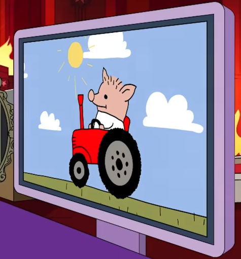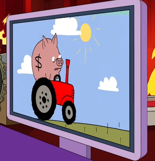 As the war drags on, the adventures of a pig driving a tractor unfold on Putin’s monitor. After the first smiling pig passes through a checkpoint gate, a second pig — this one depicted as a piggy bank with a dollar sign on its side — finds the gate blocked by two guards representing Visa and MasterCard. The piggy bank then turns around and heads back. These images play on Piglet Pete, a character in children’s books by the novelist Lyudmila Petrushevskaya. In those stories, Piglet Pete’s active imagination allows him to manifest a red tractor whenever he wishes to go somewhere. The character became an online meme symbolizing emigration from Russia, immortalized in the viral song “Piglet Pete Gets the Fuck Out of Rasha.”
