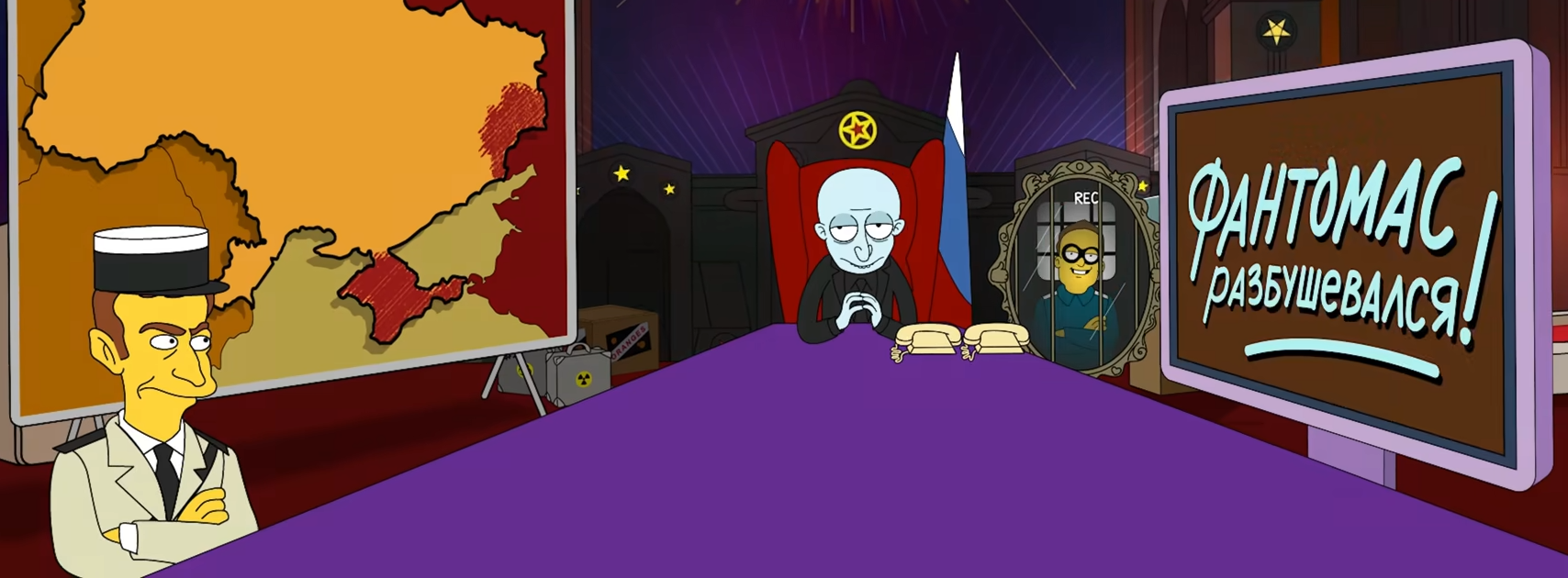 Putin’s crown briefly disappears, and he suddenly bears a striking resemblance to a certain blue-masked criminal genius: the titular character of the Fantomas trilogy directed by André Hunebelle. The second film’s title, “Fantomas Unleashed,” flashes on Putin’s monitor as a frustrated French policeman looks on, arms folded. Here, Zhgun depicts French President Emmanuel Macron as the earnest but outclassed Commissaire Juve, who can never catch Fantomas. Just days before Russia’s full-scale invasion of Ukraine, Macron made a concerted but doomed effort to talk down President Putin. The desperate phone call was recorded and included in a documentary later broadcast on French television.