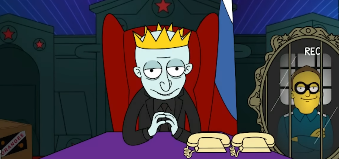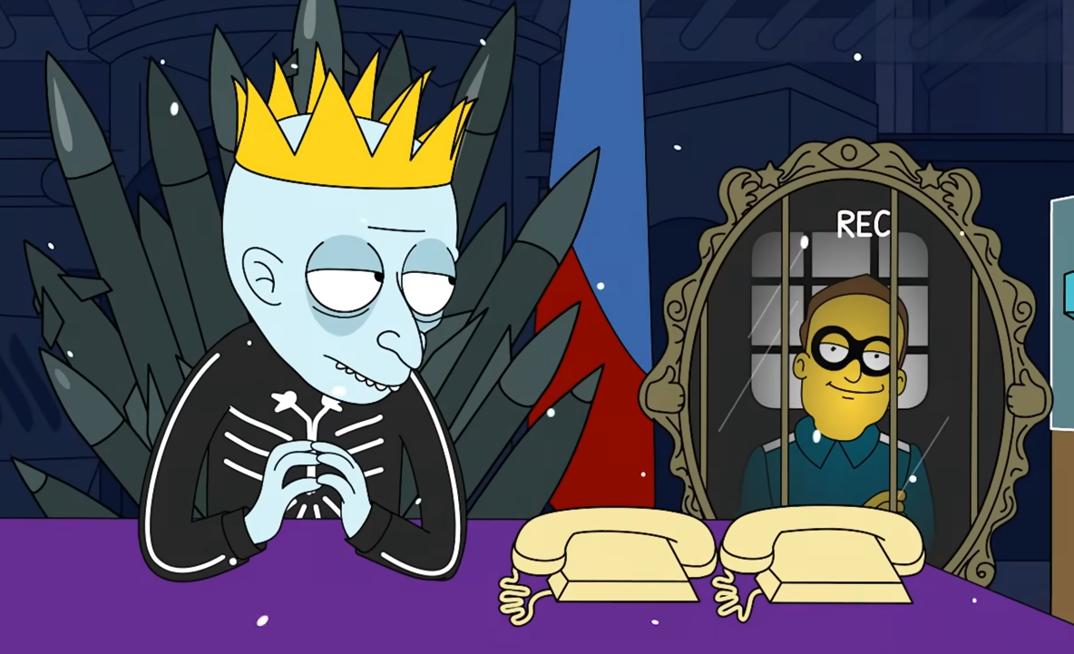 Now crowned, zombie-blue, and skeletal, Putin finally turns and looks at Navalny. The president pauses, picks up his phone, puts back the receiver, and steeples his fingers once more.
