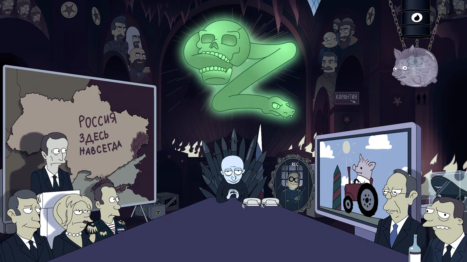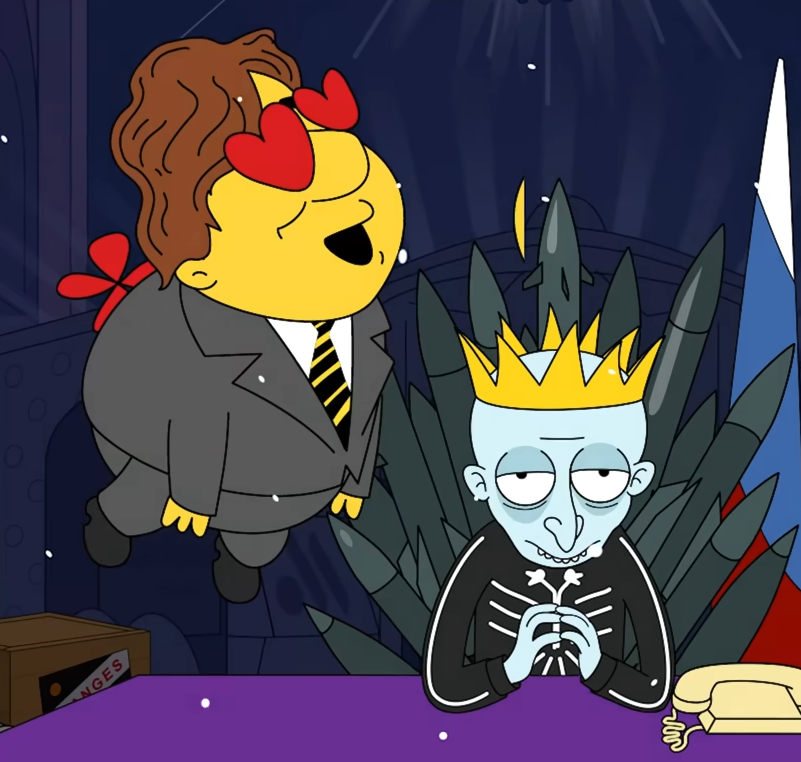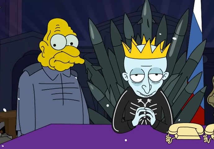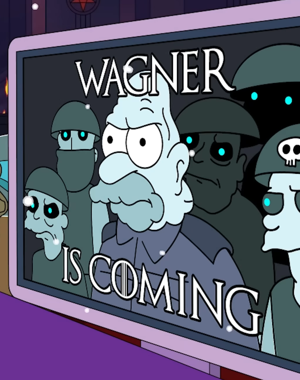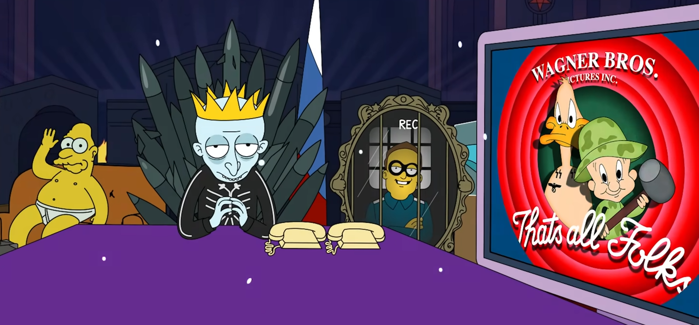 By now, Putin’s office chair has sprouted an asymmetric tangle of missiles, an allusion to the Iron Throne in the popular HBO series Game of Thrones. Continuing this theme, Grampa Prigozhin appears on Putin’s monitor, flanked by the reanimated corpses of Wagner Group soldiers. They all stare threateningly ahead, and the most famous euphemism from Game of Thrones is displayed on the screen: “Winter is coming.” The text then changes to “Wagner is coming.”