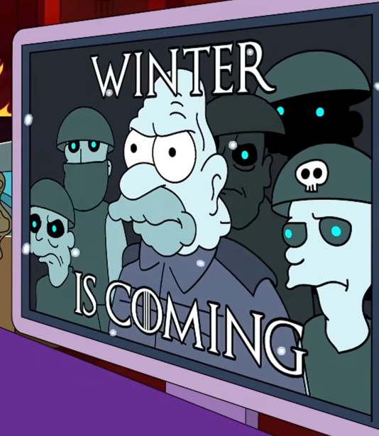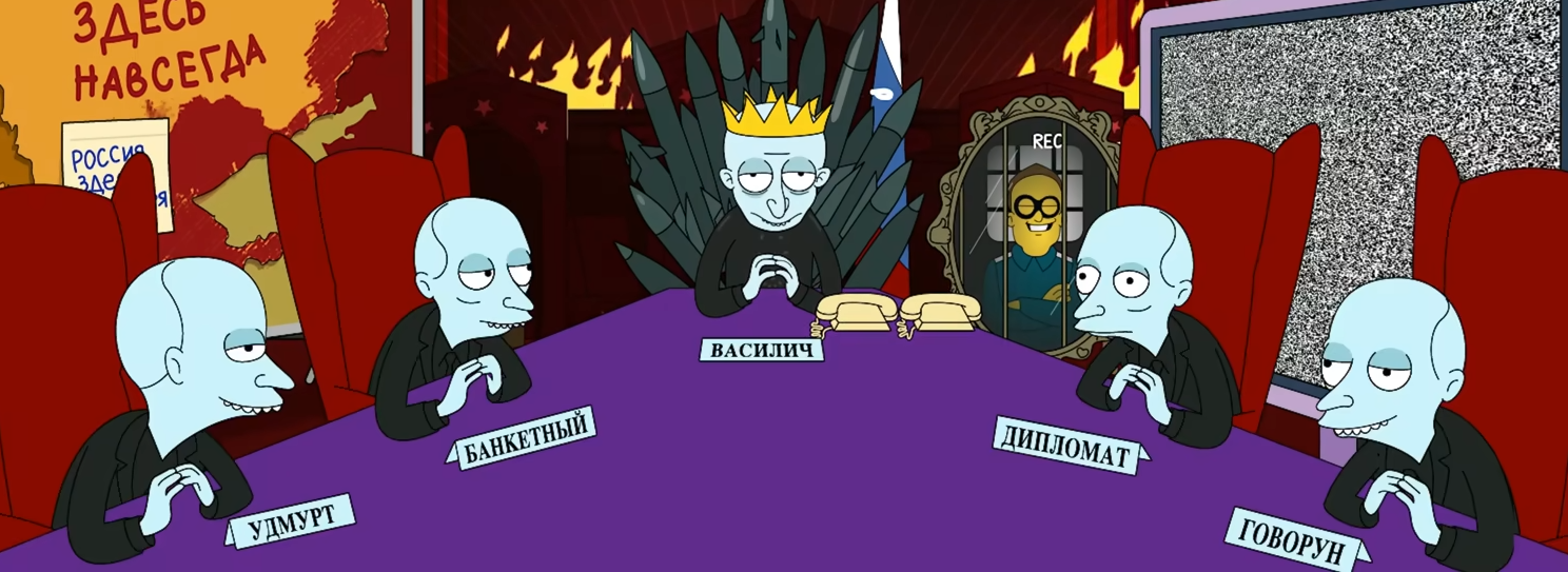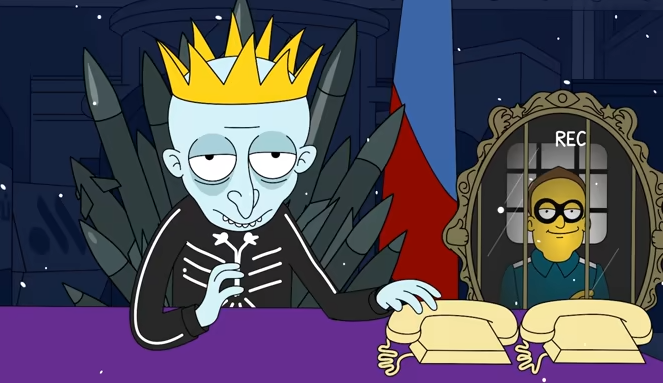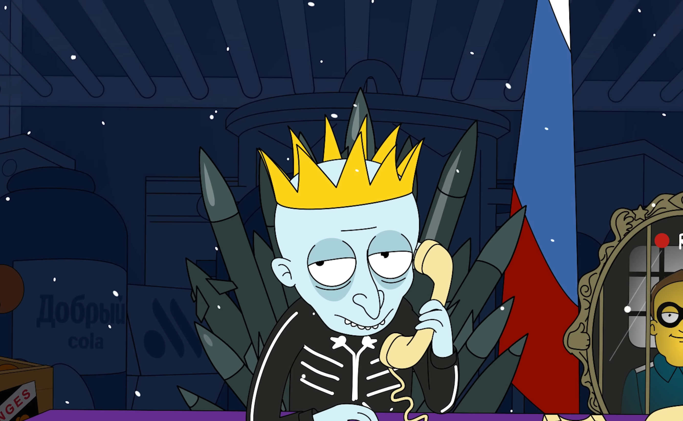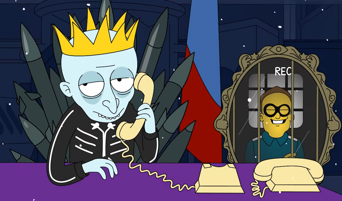 By now, Putin’s office chair has sprouted an asymmetric tangle of missiles, an allusion to the Iron Throne in the popular HBO series Game of Thrones. Continuing this theme, Grampa Prigozhin appears on Putin’s monitor, flanked by the reanimated corpses of Wagner Group soldiers. They all stare threateningly ahead, and the most famous euphemism from Game of Thrones is displayed on the screen: “Winter is coming.” The text then changes to “Wagner is coming.”