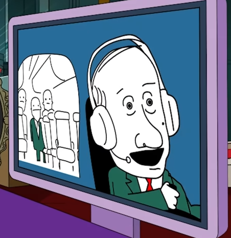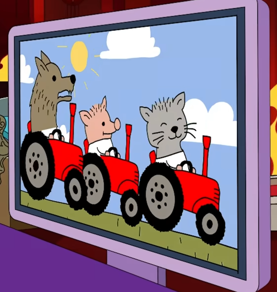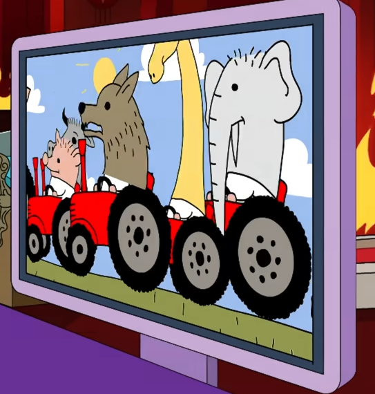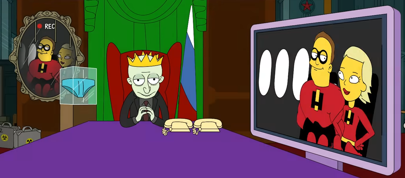 And then Grampa Prigozhin’s mutiny is done. He appears at Putin’s side, humbled and defeated. The monitor flashes a “Looney Tunes” spoof on the rebellion’s end, depicting Prigozhin as a hammer-wielding Elmer Fudd (referring to the group’s execution of multiple prisoners with sledgehammers) and shows Wagner cofounder Dmitry Utkin as a “skinhead” Daffy Duck, complete with Utkin’s multiple Nazi tattoos, including the SS insignia. Our final glimpse of Grampa Prigozhin shows him on a couch in his underwear, referring to a leaked photograph allegedly taken at a Belarusian military camp, where Wagner Group retreated and tried to regroup after its rebellion. The monitor quickly shows a few frames of the closing credits from the children’s comedy show “Yeralash” (including the phrase: “That’s all!”), and Prigozhin is gone for good.