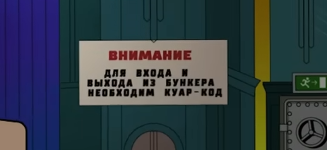 Zhgun depicts the coronavirus as a hybrid of Homer Simpson and Shrek, emerging from his outhouse with a triumphant whoop. The coming lockdowns will empower the Putin regime in dramatic new ways. The secret police return to the Magic Mirror, and Putin’s office (his curtains now drawn completely) is festooned with frightening PSAs about COVID-19. The president also drinks from a fast-food “Bunker King” cup — a reference to the “Bunker Grandpa” meme that spread about Putin due to his strict self-isolation during the pandemic. Later, we see a sign above one of the doors in Putin’s office that reads, “Attention: For entry into and exit from the bunker, a QR code is required.” This refers to how the Russian authorities relied heavily on QR codes when issuing permits for access and the right of movement in large cities like Moscow.