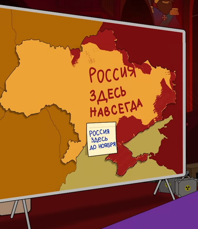 The map of Ukraine first appears as Lenin’s “idea” (see above). As the video progresses, Russia’s blood-red occupation pulses in and out of Ukrainian territory, mirroring the lands held by Russia’s invasion force. A message appears over Ukraine reading, “Russia is here forever.” This is a phrase United Russia senior party member Andrey Turchak infamously uttered in May 2022 while visiting occupied Kherson. The Ukrainian military debunked Turchak’s proclamation just a few months later when it liberated the city, which Zhgun depicts as a sticky note plopped to the Ukraine map that reads, “Russia is here until November.”