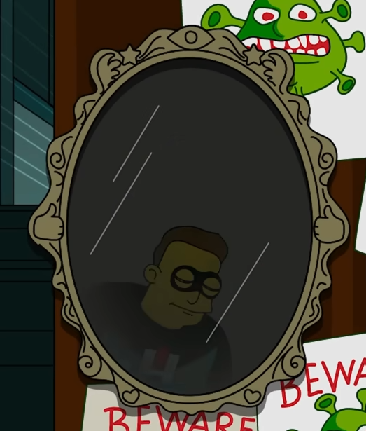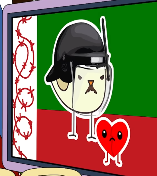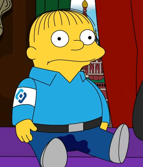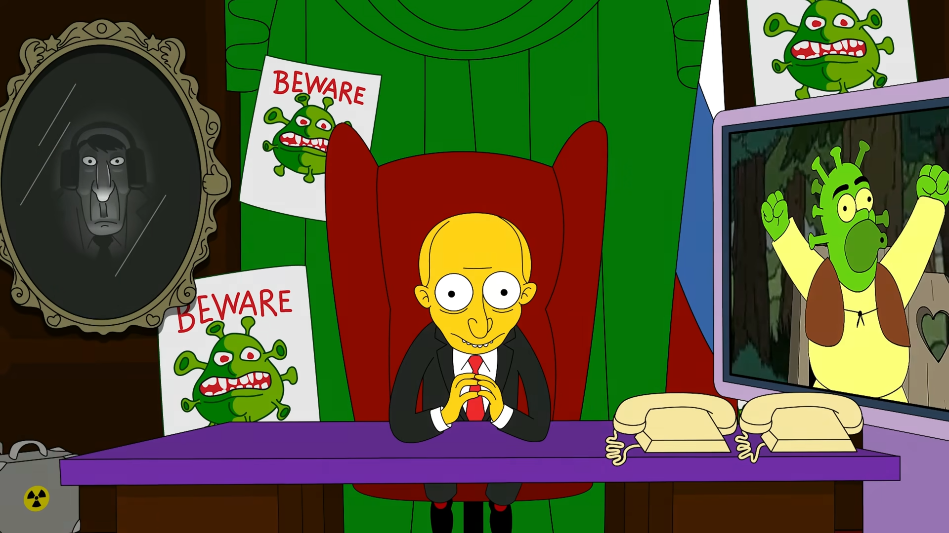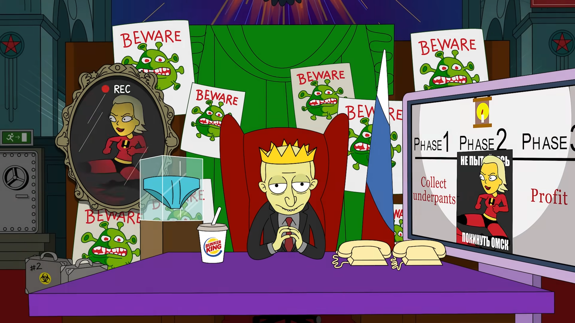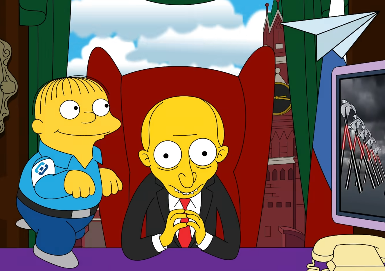 As Navalny’s 2018 presidential campaign haunts the mirror on the wall, the character Ralph Wiggum runs across Putin’s desk, chasing a paper airplane in the shape of the Telegram logo. Ralph wears an arm patch with the symbol of Roskomnadzor, Russia’s federal censor. In 2018, this agency started ordering Russian Internet service providers to block access to the messaging app Telegram. Officials eventually lifted the ban in 2020 after failing to stop Russians from using the service — a defeat embodied in Ralph peeing his pants.