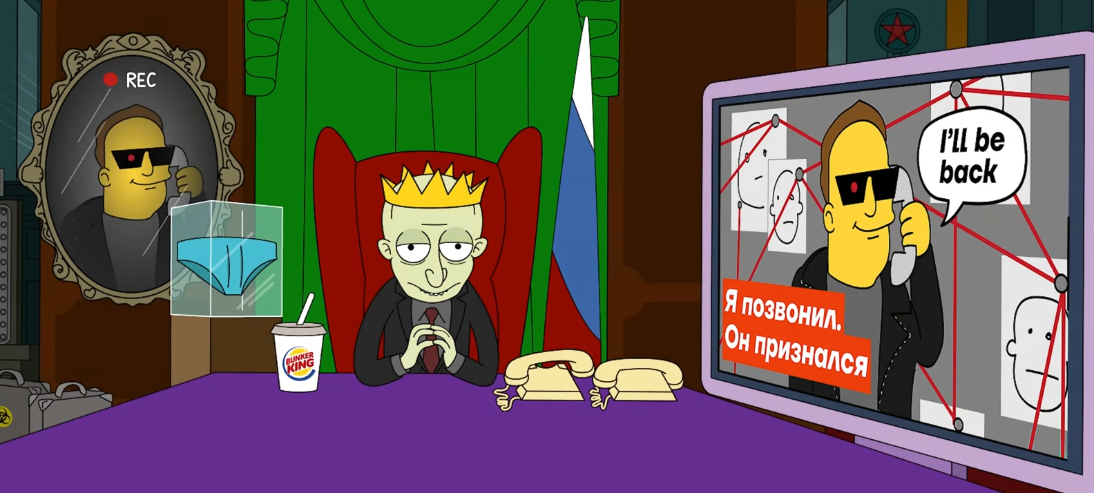 Then Navalny sheds his Mr. Incredible persona and appears as Arnold Schwarzenegger’s T-800 Terminator character. The Russian text on the screen reads, “I called. He confessed,” referring to Navalny’s December 2020 YouTube video (which uses footage that appears in the Oscar-winning 2022 American documentary film directed by Daniel Roher) showing how he fooled FSB operative Konstantin Kudryavtsev into sharing secret details about the agency’s attempt on his life. Zhgun’s Terminator references foreshadow Navalny’s burial in March 2024, when his coffin was lowered into the ground as the film’s soundtrack played, alluding to the T-800’s heroic submersion in molten metal. The movie was reportedly one of Navalny’s favorites.