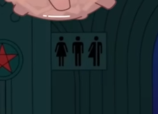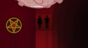 Neon pentagrams suddenly illuminate over the red military stars in Putin’s office, and fire erupts from the walls behind him. From the restroom sign on the wall to Putin’s left, the transgender symbol vanishes. The Russian authorities’ anti-LGBT policies are well-known and growing, but Zhgun here could be referring to the federal government’s explicit ban on gender transition, adopted in the summer of 2023, and to the Russian Supreme Court’s ruling in November 2023 to outlaw the so-called “international LGBT movement.”