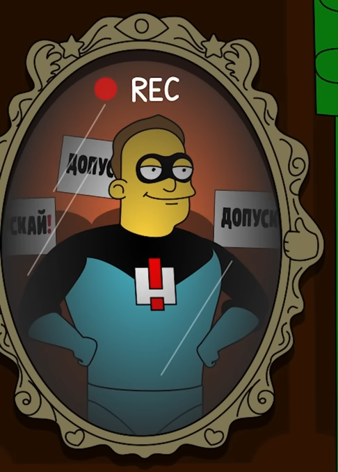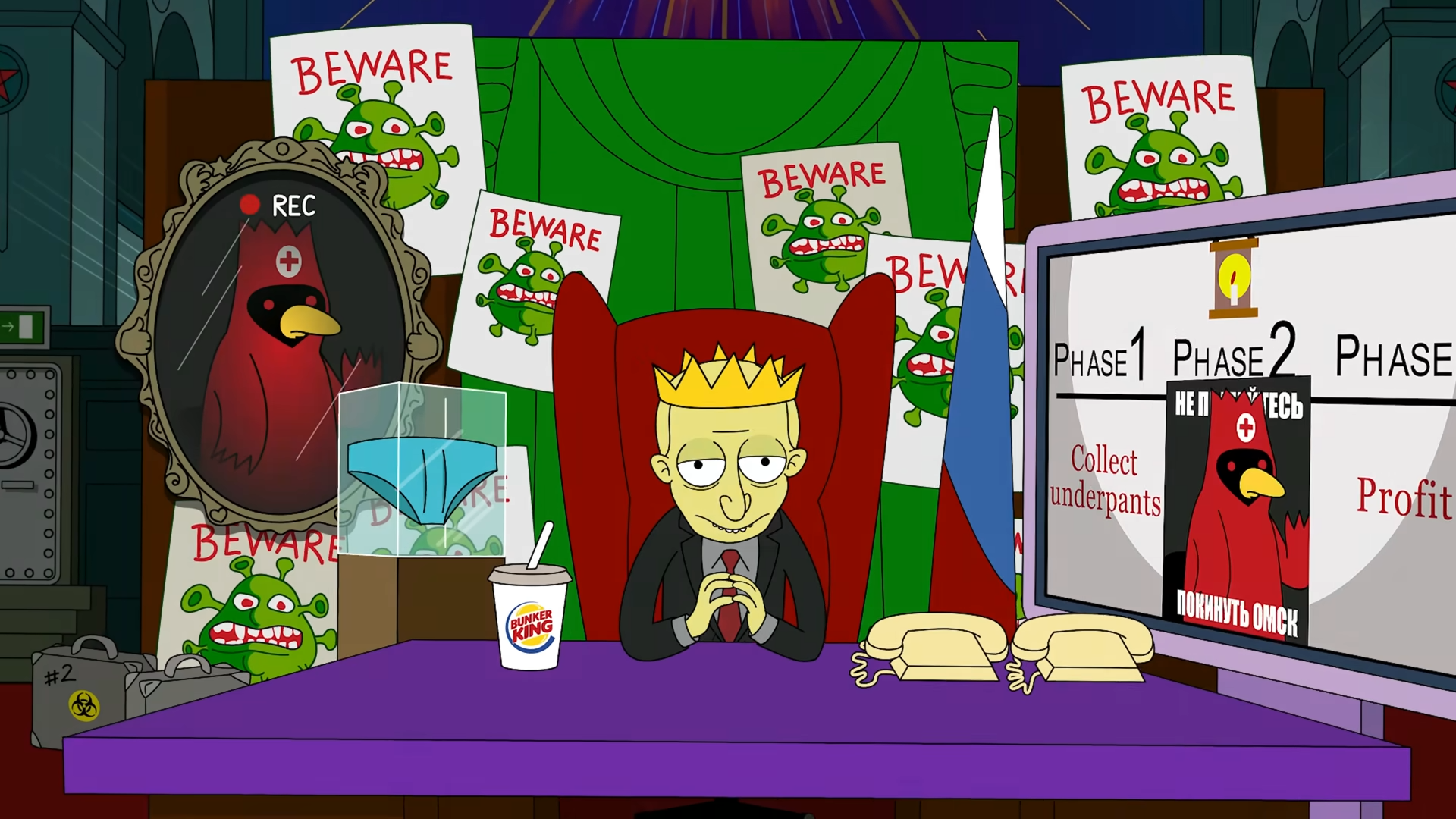 Superhero Navalny suddenly disappears from the Magic Mirror and is replaced by “Winged Doom,” also known as “The Omsk Bird.” Based on an original character created by artist Heiko Muller, this bird cartoon has come to be associated on the Russian Internet with “everything psychedelic, surreal, and drug-induced” and specifically with the message: “Welcome to Omsk!” On Putin’s monitor, Winged Doom is dressed as a doctor and appears with the text: “Don’t try to leave Omsk.”