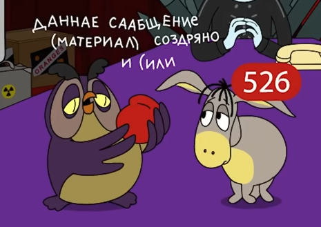 To depict the Russian Internet’s descent into government censorship and jingoism, Zhgun shows Owl from Winnie-the-Pooh reciting the long and tedious “foreign agent” disclosure that litters much of the content now published on networks like Telegram. A tired Eeyore (whose name in Russian is “Ia-Ia” and could be interpreted as innostranyi agent, or “foreign agent”) stares blankly as his unread notifications pile up. In a satire of Russia’s regulations, Zhgun’s Owl reads the required disclosure with the character’s typical spelling errors, saying what in English might be rendered as: “Thu fallowing messige or muhterial was creeated and (or)...”