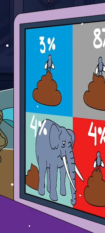 The final images on Putin’s monitor show piles of feces, each with its own little fly. One of these flies then morphs into to elephant — a reference to a Russian Internet meme known as “Our Elephant,” which is used to describe someone as “on our side” (“based” in meme terms). The phrase was originally more popular in conservative circles but has since gained traction with the general public (often for ironic use). In Russia’s 2024 presidential election, opposition voters coped with their lack of genuine options by facetiously celebrating the most anti-Putin candidates available (first Nadezhdin and then New People Party candidate Vladislav Davankov) as “our elephants.” Zhgun’s cartoon also plays on the Russian aphorism for “making a mountain out of a molehill,” which in Russian is literally “to make an elephant out of a fly.”