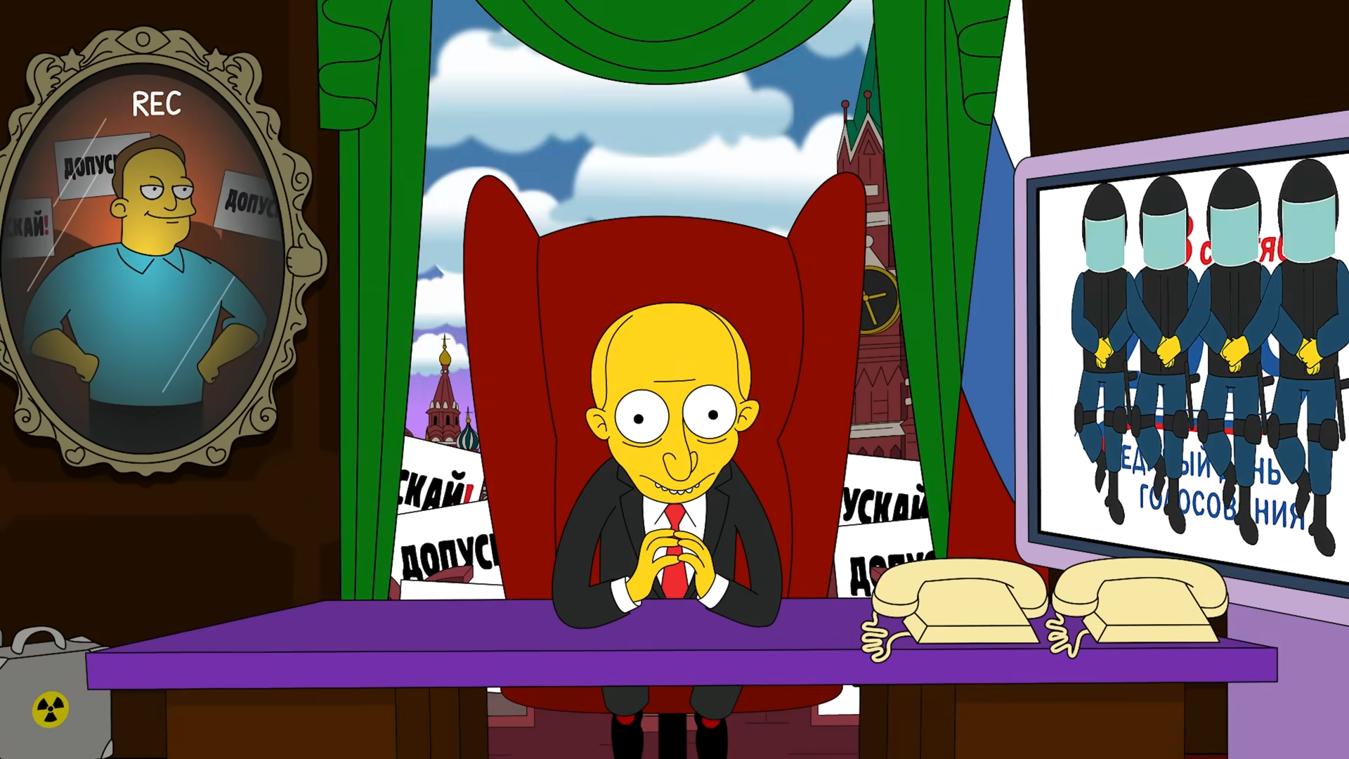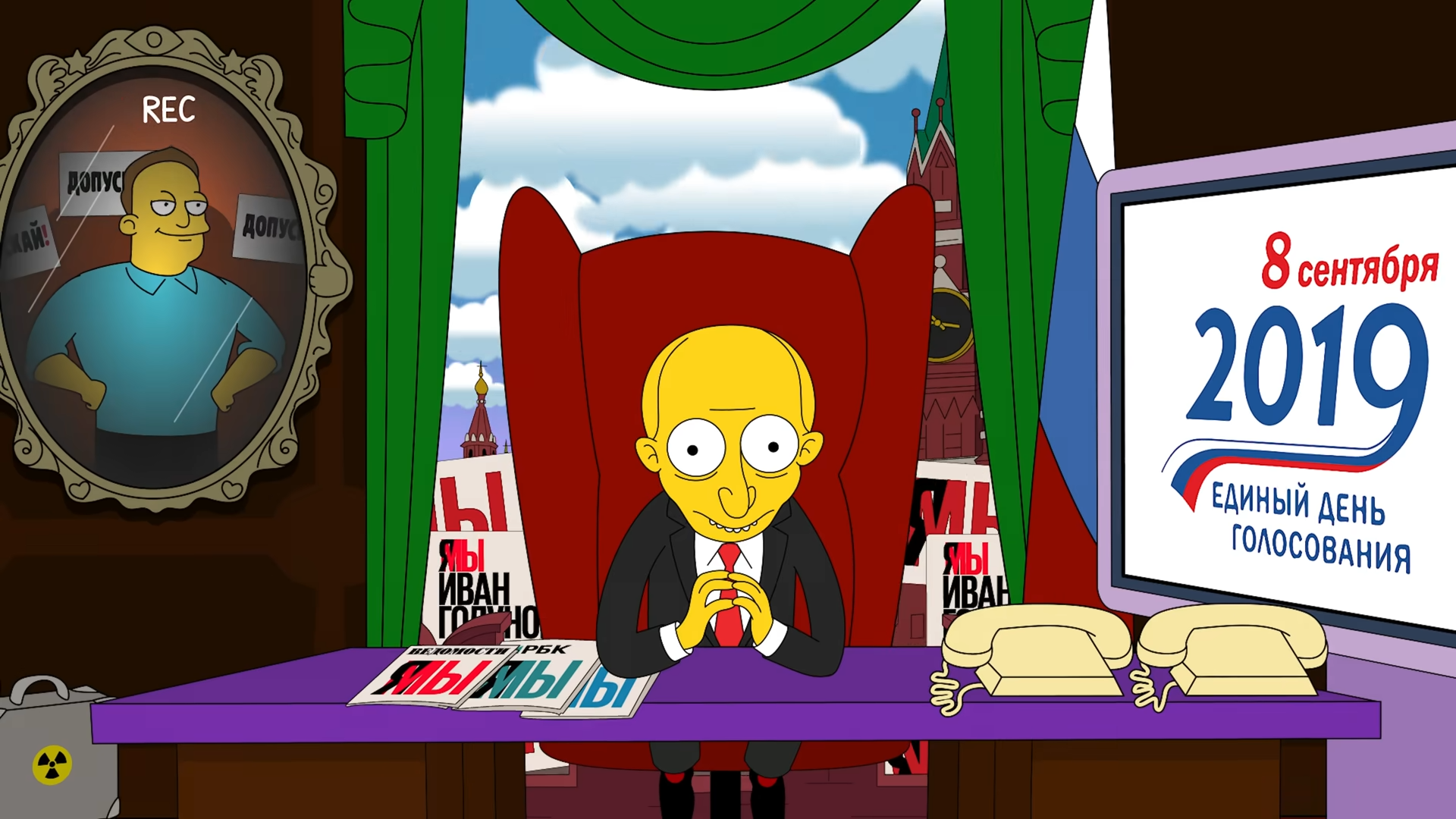 Now Alexey Navalny returns to the Magic Mirror and slowly transforms into Mr. Incredible (from the Pixar movies). On Putin’s monitor, riot police perform the Dance of the Little Swans from Swan Lake over an announcement for Russia’s United Voting Day on September 8, 2019. Throughout the summer, Moscow witnessed several public protests against election officials’ decision to bar independent candidates from the City Duma race. These demonstrations led to a police crackdown and numerous felony prosecutions.
