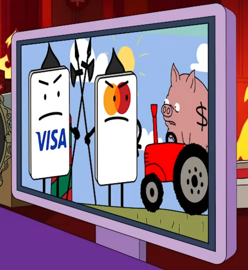 In Zhgun’s cartoon, Visa and MasterCard blocking the exit for emigres’ money represents the repercussions of the two financial giants’ decision to pull out of Russia over the invasion of Ukraine. The companies’ withdrawal did not deactivate Mastercard and Visa-branded cards for domestic transactions in Russia, but it did disable the cards for payments abroad, effectively forcing Russians who fled the country to rely on cash (amid a $10,000 cap on citizens traveling abroad).