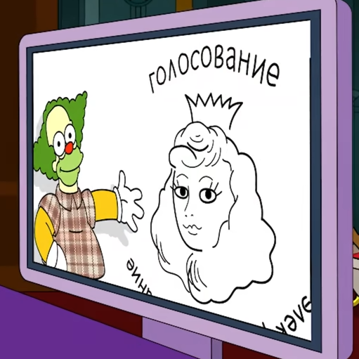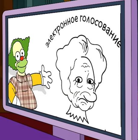 Putin’s monitor then shows the wild-haired journalist Alexey Venediktov as Krusty the Clown hyping “electronic voting,” but Zhgun depicts the project as the viral illusion of a beautiful young princess who’s also a withered old woman. Zhgun first tweeted this cartoon in September 2021 to criticize online voting in Russia’s 2021 legislative elections, which Venediktov promoted as the organizer of the technical working group that helped develop the voting software. Also, as the head of Moscow’s public monitoring headquarters, Venediktov defended the online system, which election observers have described as a “black box” under the authorities’ total control.