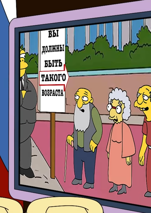With the World Cup over, the sky behind Putin grows overcast as the Chief Wiggum character arrives on the president’s monitor to deliver some bad news to a group of senior citizens waiting in line. The chief raises a sign reading, “You must be THIS age” — an allusion to legislation enacted in October 2018 to hike Russia’s retirement ages from 55 to 60 for women, and from 60 to 65 for men. The new policy was deeply unpopular with millions of Russians.