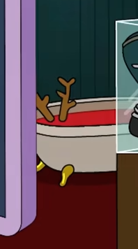 With Alexey Navalny behind bars, Zhgun’s camera pulls back to reveal a grander, more diabolic setting in Putin’s office. To the right, there’s a bathtub filled with blood and antlers, referring to an investigative report by journalists at Proekt Media that cites claims by the president’s acquaintances that he bathes in an extract made from boiled deer antlers, supposedly to boost his cardiovascular system and rejuvenate his skin. (By this point in Zhgun’s cartoon, incidentally, Putin’s skin has taken on a ghoulish green hue.)