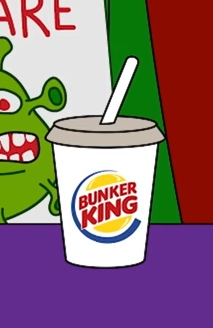 The final setting of Putin’s office is neither the Kremlin nor the Armed Forces’ Main Cathedral but a refrigerator. Over his right shoulder, there’s a Soviet-era three-liter jug of Dobry Cola (the soft drink that replaced Coca-Cola products in Russia after the American multinational left the Russian market) and a boxed burger from Vkusno i Tochka (the fast food chain that replaced McDonald’s restaurants after the latter shut down its Russian stores). In addition to being a joke about import substitution, showing Putin “on ice” is another allusion to conspiracy theories about his supposed death.