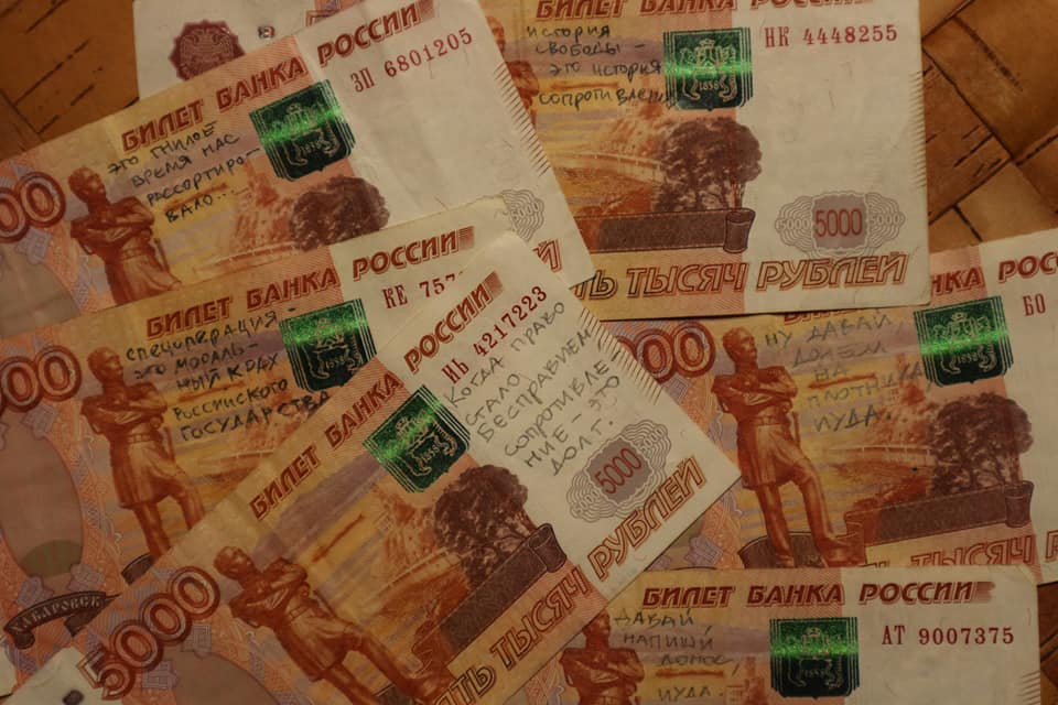 Штраф он оплатил, но и к этому процессу подошел творчески и на каждой купюре написал антивоенное воззвание: "Когда право стало бесправием, сопротивление – это долг", "История свободы – это история сопротивления", "Спецоперация – это моральный крах Российского государства", "Запрещаю тратить эти деньги на Путина и его холуев".