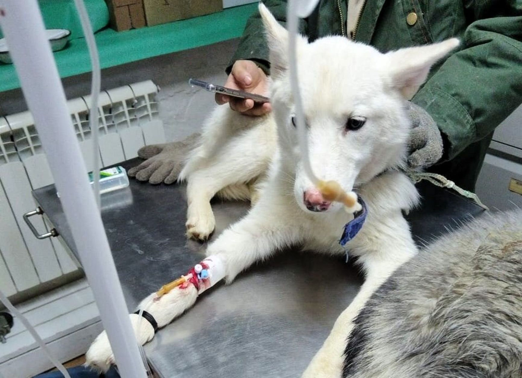 The volunteers took three dogs with them: a half-dead male Laika, an emaciated female German shorthaired pointer, and a small mongrel puppy. All were taken to a veterinary clinic, but the Laika could not be saved and died on the same day.